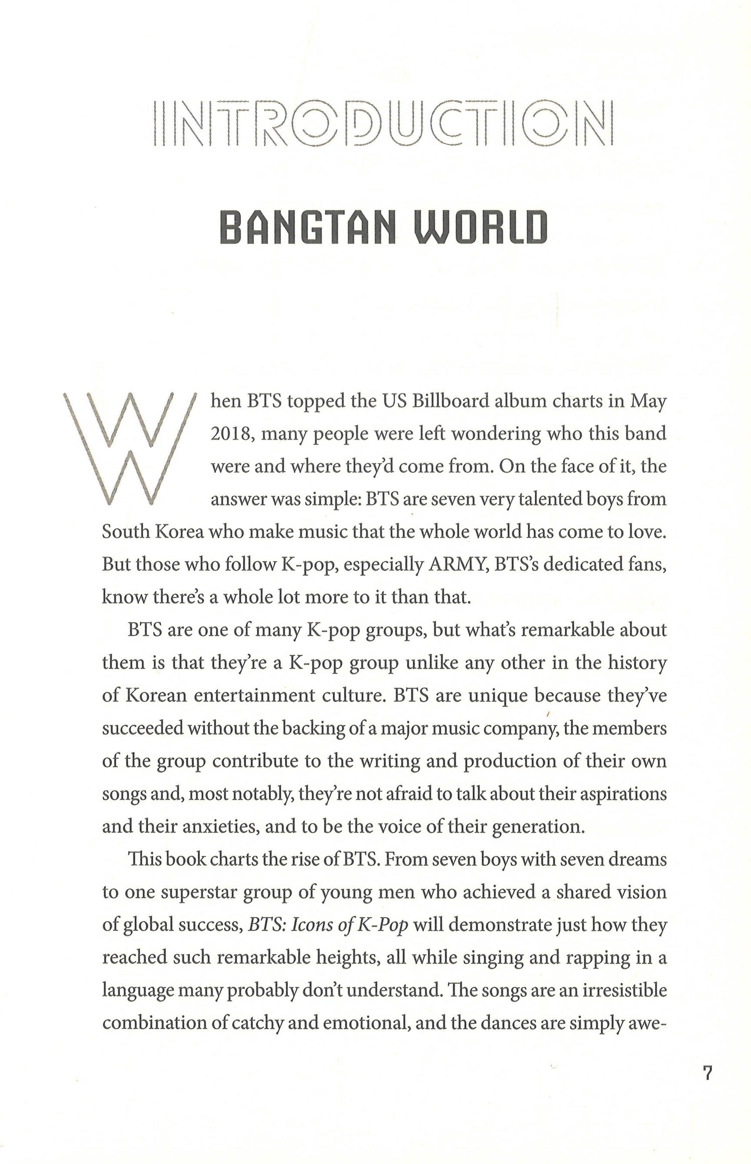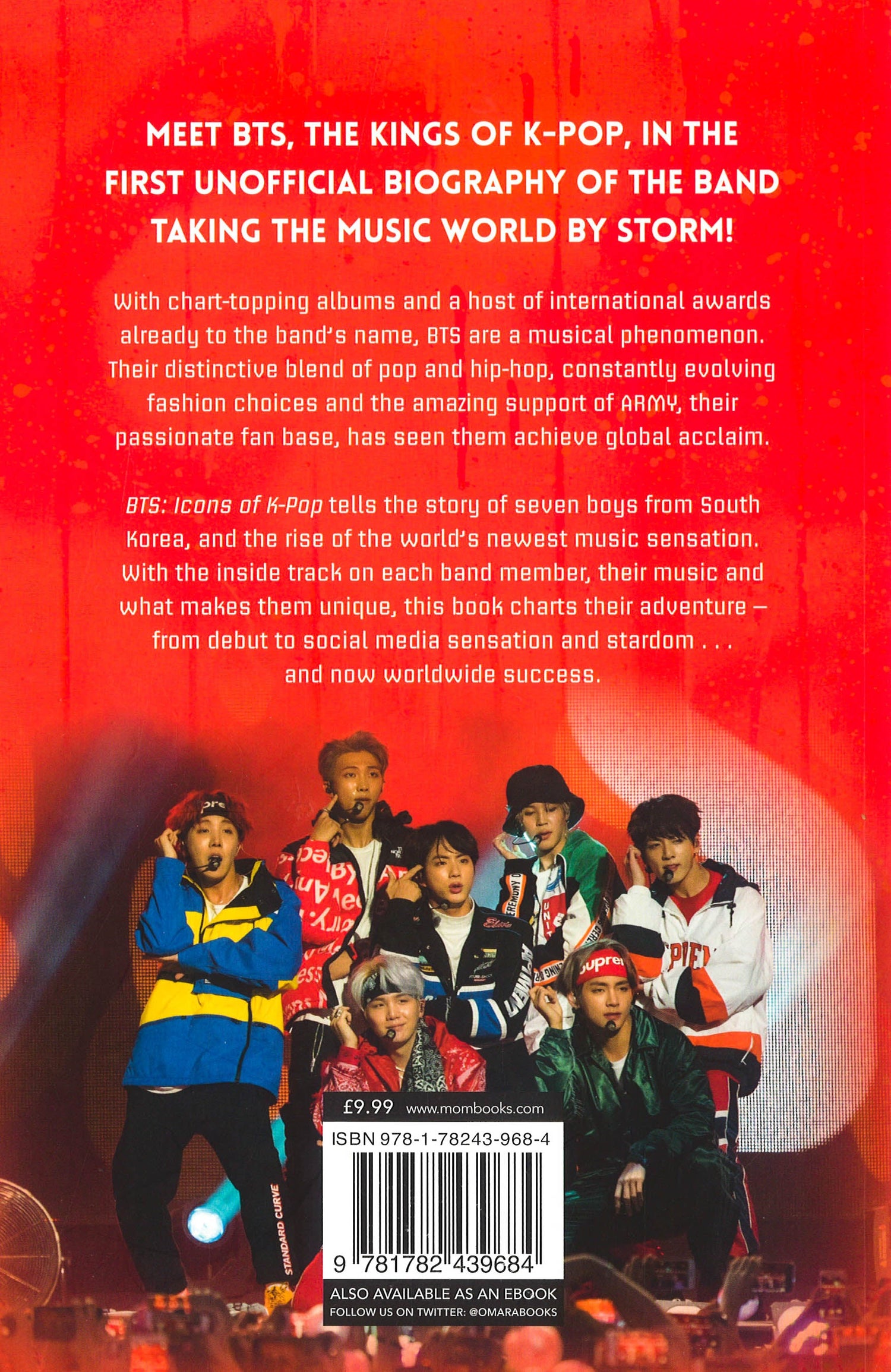 BTS, also known as Bangtan Sonyeondan or 'Bulletproof Boy Scouts', are the breakthrough K-pop band. For the first time, this book tells the story of the Korean boy band with a global army of fans, who have propelled their heroes to the top of the charts all over the world.BTS is the breakthrough K-pop band. For the first time, this unofficial biography tells the story of the Korean boy band with a global army of fans, who have propelled their heroes to the top of the charts all over the world.Seven good-looking boys - RM, Jin, Suga, J-Hope, Jimin, V and Jungkook - who can dance as well as they can rap and sing, are tearing up the global music charts. Nothing new? Think again. BTS, who rose to fame in their native South Korea in 2013 and who sing almost entirely in Korean, are now a sensation in the US, the UK and the rest of the world.K-pop is a growing phenomenon in the West, and over the last few years, it has steadily gathered a huge global following. With their talent, dedication, good looks, fabulous choreography, and catchy blend of pop, hip hop and RnB, BTS are leading the advance.- BTS's latest album 'Love Yourself: Answer' went straight to #1 in the US charts, following the success of their previous album, 'Love Yourself: Tear', which was the first ever Korean album to achieve this- Over 17 million followers on Twitter- They have been profiled in US Vogue - the first K-pop band to be granted such an honour- The music video for IDOL broke YouTube streaming records, being viewed 46 million times in the first 24 hours; the view count is now in the hundreds of millions- They won the 2018 Billboard Music Award for 'Top Social Artist' for the second year in a row- Listed by Forbes as the most retweeted artist on Twitter in March 2016 - and their fanbase has ballooned since then- Named in Time magazine's 'Top 25 Most Influential People on the Internet 2017' list- Their 2018-2019 world tour sold out within minutes of tickets going on saleExtensively researched, and written in an upbeat and accessible style, this book interweaves the success stories of each of the boys with how the band got together, while documenting their amazing rise to fame in Southeast Asia, and then the world. It includes 16 pages of full colour photographs of the band playing live, posing and having fun.Also available:9781780556017 BTS: Test Your Super-Fan Status 9781789291339 BTS and Me: Your Unofficial Fill-In Fan Book