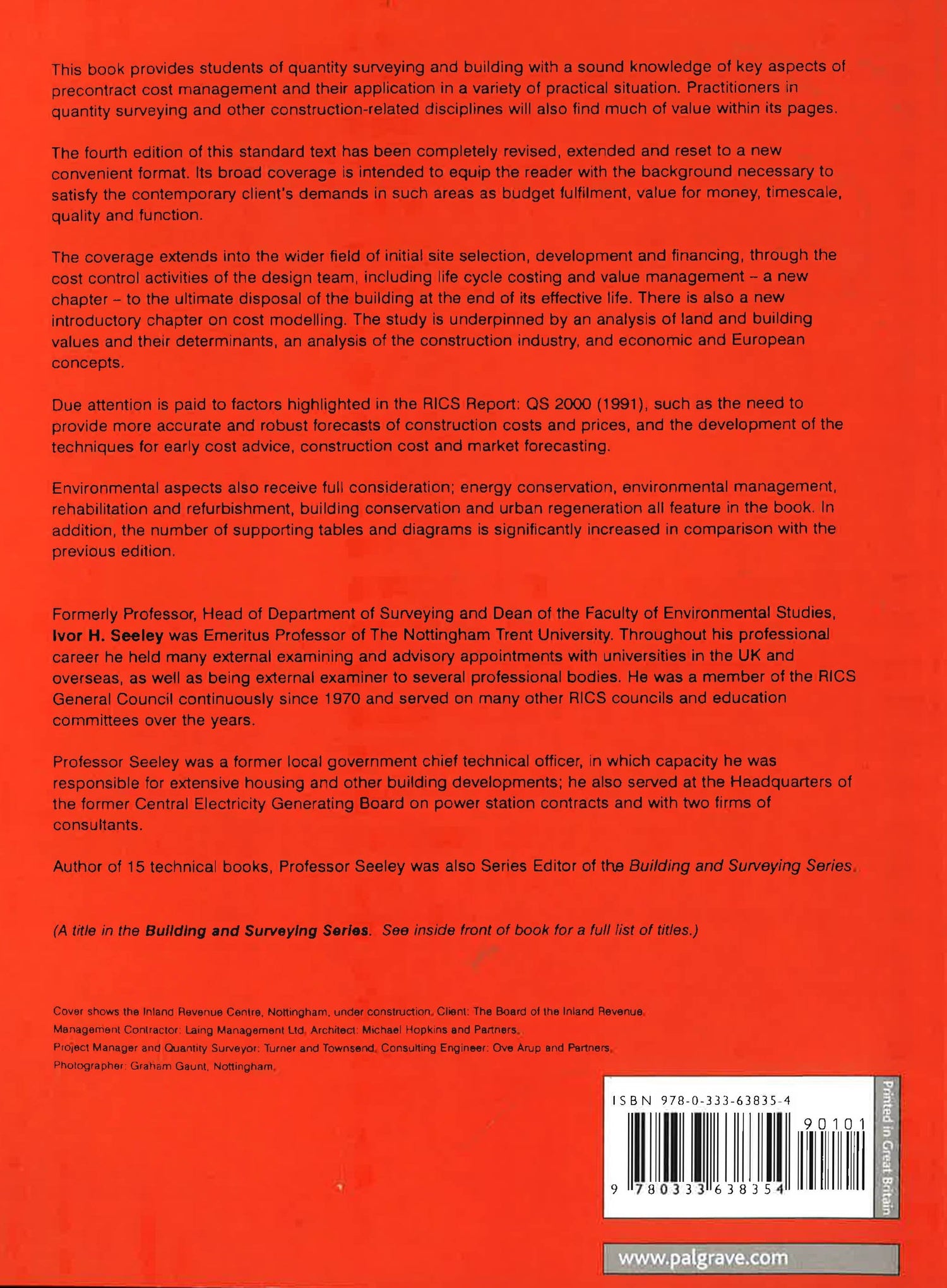 This comprehensively rewritten, updated and extended new edition of this established text focuses on what has become the most important single facet of the quantity surveyor's role - cost management. The scope of the book has been broadened to take account of the widening and more sophisticated cost management and control service that clients now require. The book examines the factors influencing building costs and how the precontract costs can be estimated, analysed and controlled, to ensure that buildings can be completed within the agreed budget and timescale, and be of acceptable quality, function effectively and provide value for money. A new chapter on value management has been added, together with an introductory chapter on cost modelling; the chapter on life cycling costing is extended, while the sections on energy conservation and occupancy costs are expanded. Throughout the text many new case studies, with supporting tables and diagrams, are included in order to enhance the value of this book to the student and the practitioner.