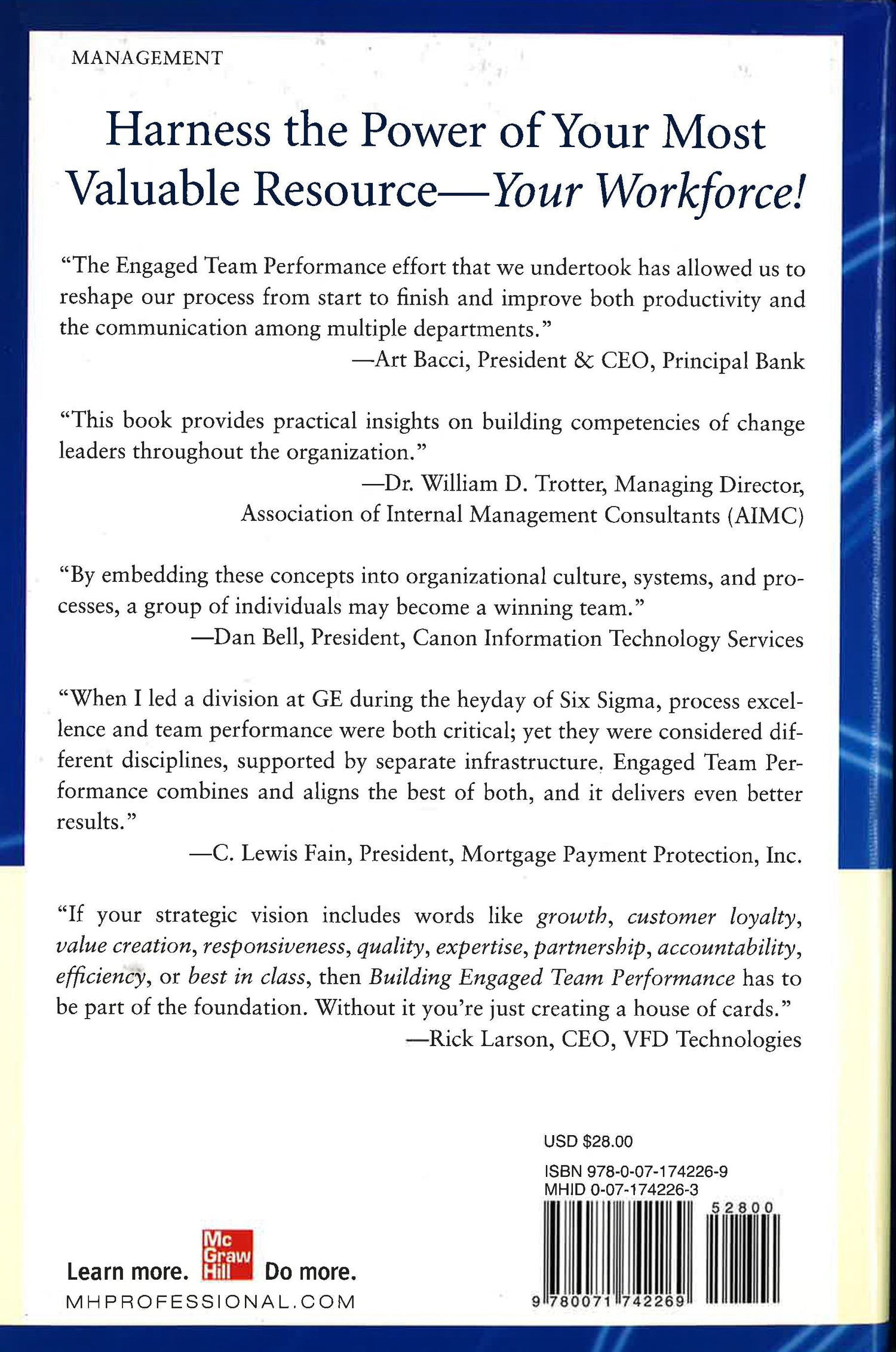 The bestselling coauthor of The Six Sigma Way explains the next wave of business improvement: Driving breakthrough gains using "the people side" of performance in productivity initiatives. Harness the Power of Your MostValuable Resource-Your Workforce!Process improvement approaches likeSix Sigma and Lean Enterprise haveworked wonders for countless organizations,but in the drive for true excellence,these approaches are only one important partof the formula. Building Engaged Team Performanceexplains the next wave of businessimprovement: driving breakthrough gains byintegrating process improvement with "thepeople side" of performance.Breaking new ground in the world oforganizational improvement, performance managementexpert Dodd Starbird teams upwith Roland Cavanagh, coauthor of the bestsellingThe Six Sigma Way, to present a systemfor aligning and optimizing processes andthe efforts of any organization's most valuableasset: people.Combining the principles from TotalQuality Management (TQM), Six Sigma,Lean, and Socio-Technical Systems, EngagedTeam Performance helps you harness the massivepotential of human performance that isnot captured by process improvements alone.Illustrated through real-life stories, BuildingEngaged Team Performance offers a stepby-step program that shows you how youcan more than double the productivity of yourbusiness. The authors' client examples are adiverse group of transactional and manufacturingorganizations that have used EngagedTeam Performance to:Increase employee efficiency by 50%and save millions of dollarsConsistently deliver on criticalcustomer requirementsProvide visual data for instantdecision making* Create realistic staffing modelsfor sustainable capacityEstablish standards for both team andindividual performanceDevelop leadership that facilitates teamownership of executionBuilding Engaged Team Performance providesthe tools for building a superior systemthat optimizes effectiveness of outcomes forcustomers and efficiency of resource usage.Never before have human performance andprocess improvement been so closely linked ina single, sustainable method. Catch the nextwave of business improvement with EngagedTeam Performance.Praise for Building Engaged Team Performance"The Engaged Team Performance effort that we undertook has allowed us toreshape our process from start to finish and improve both productivity andthe communication among multiple departments."Art Bacci, President & CEO, Principal Bank"This book provides practical insights on building competencies of changeleaders throughout the organization."Dr. William D. Trotter, Managing Director,Association of Internal Management Consultants (AIMC)"By embedding these concepts into organizational culture, systems, and processes,a group of individuals may become a winning team."Dan Bell, President, Canon Information Technology Services"When I led a division at GE during the heyday of Six Sigma, process excellenceand team performance were both critical; yet they were considered differentdisciplines, supported by separate infrastructure. Engaged Team Performancecombines and aligns the best of both, and it delivers even betterresults."C. Lewis Fain, President, Mortgage Payment Protection, Inc."If your strategic vision includes words like growth, customer loyalty,value creation, responsiveness, quality, expertise, partnership, accountability,efficiency, or best in class, then Building Engaged Team Performance has tobe part of the foundation. Without it you're just creating a house of cards."Rick Larson, CEO, VFD Technologies