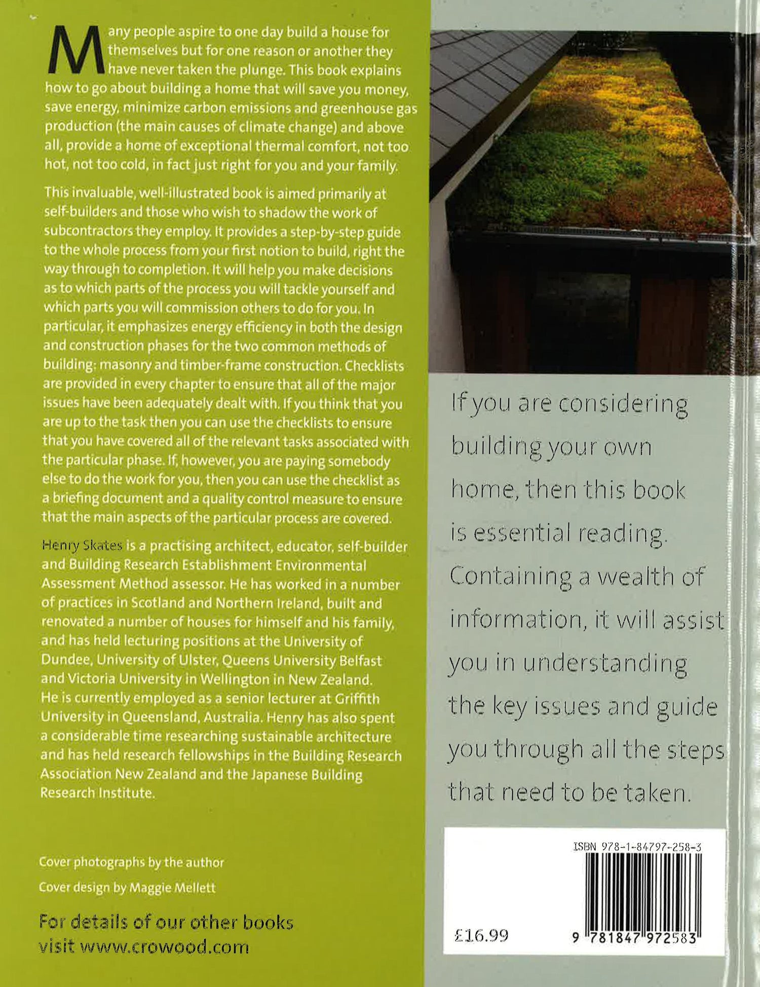 Many people aspire to one day build a house for themselves but for one reason or another they have never taken the plunge. This book explains how to go about building a home that will save you money, save energy, minimize carbon emissions and greenhouse gas production [the main causes of climate change] and above all, provide a home of exceptional thermal comfort, not too hot, not too cold, in fact just right for you and your family.
