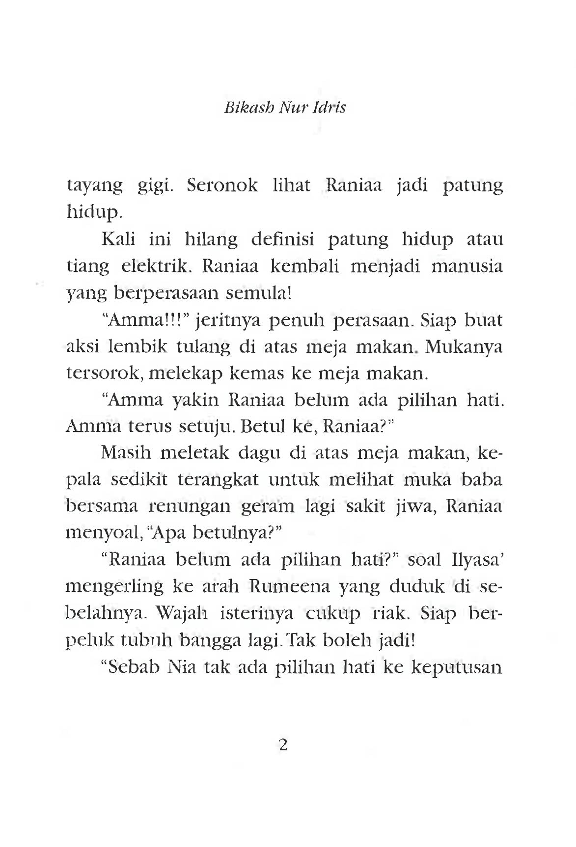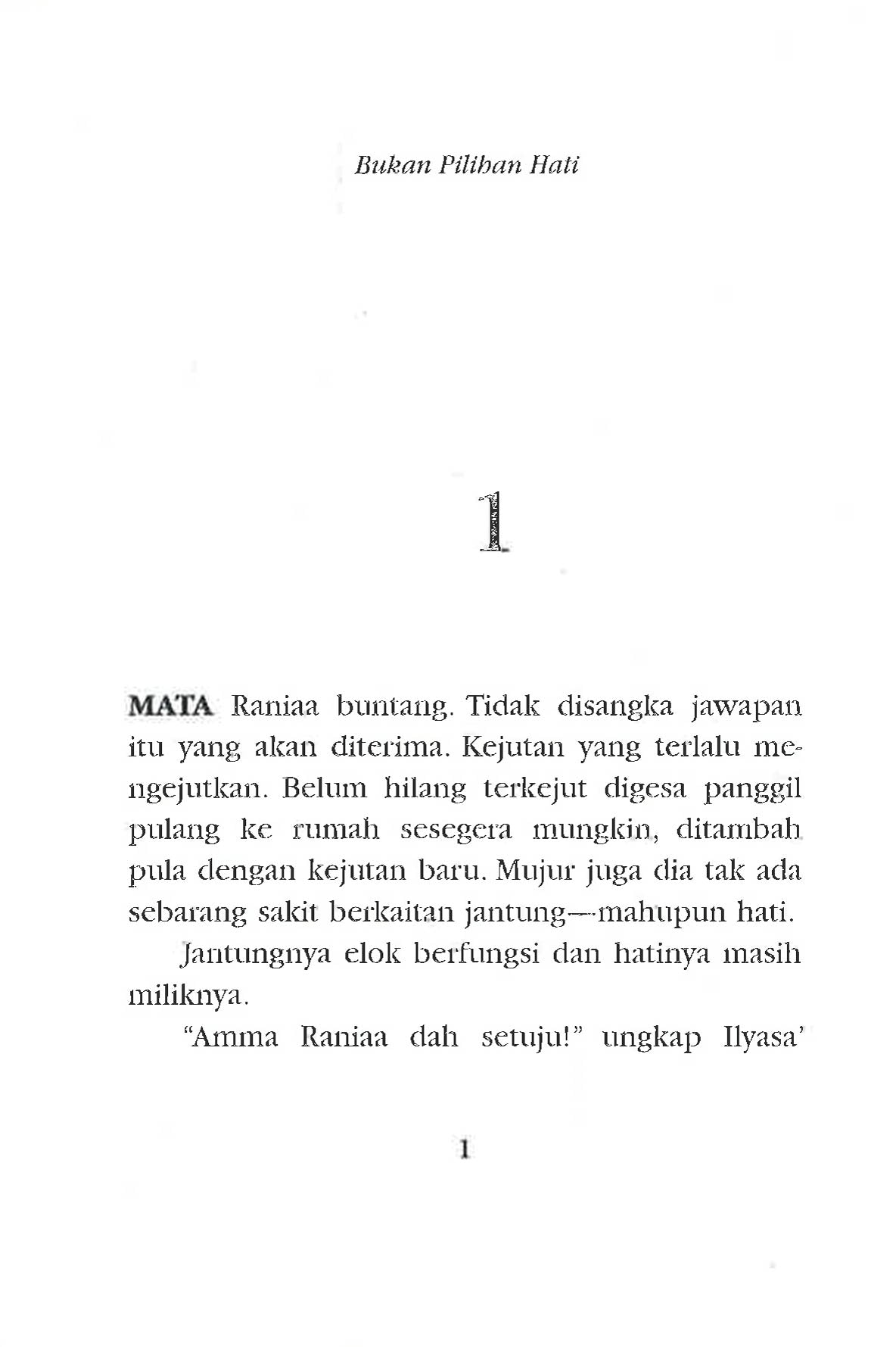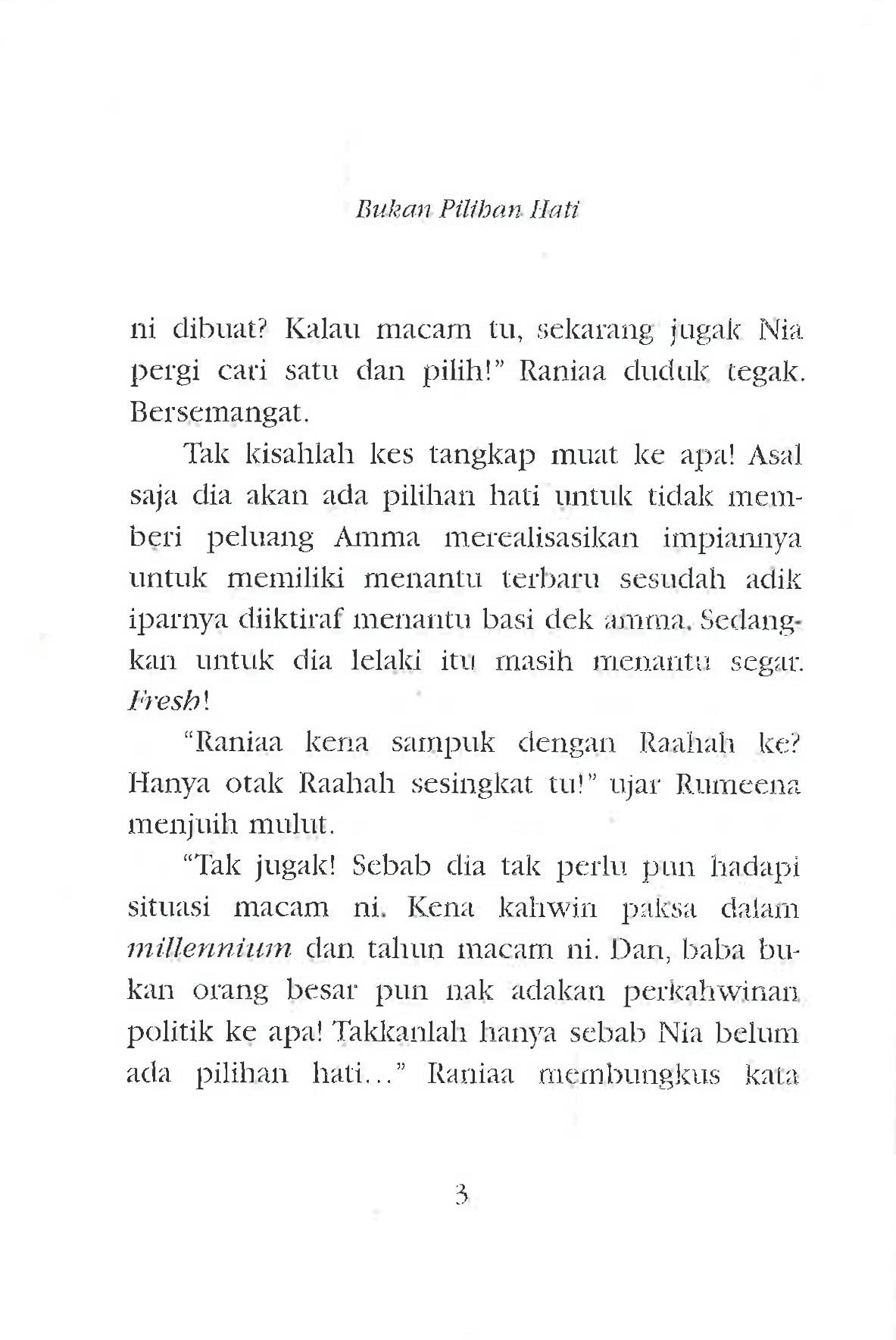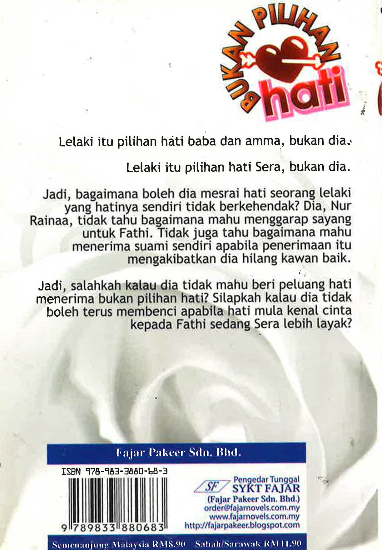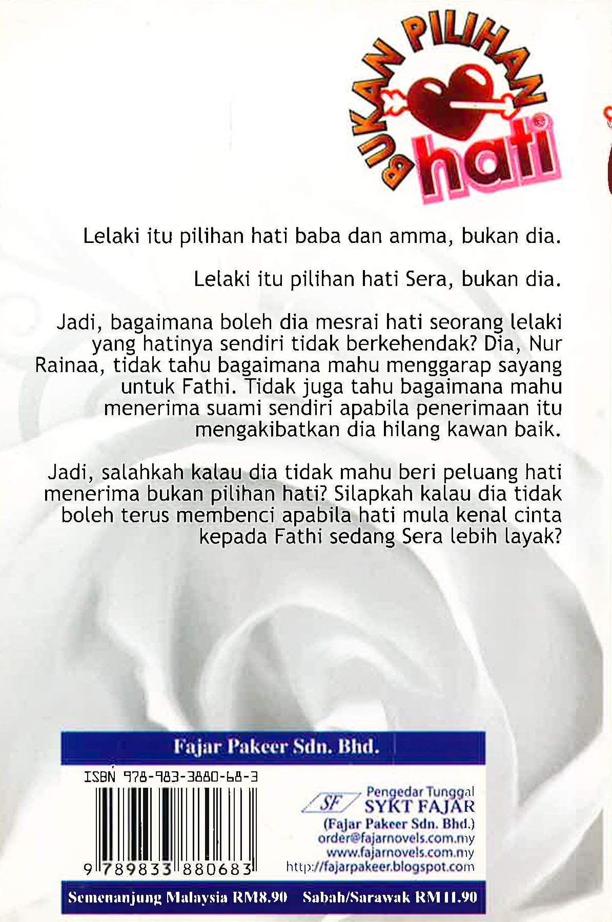 Lelaki itu pilihan baba dan amma, bukan dia. Lelaki itu pilihan hati Sera, bukan dia, Jadi, bagaimana dia boleh measai hati seorang lelaki Yang hatinya sendiri tidak berkehendak? Dia Nur Rainaa, tidak tahu bagaimana mahu menggarap sayang untuk Fadhi. Tidak juga tahu bagaimana mahu menerima suami sendiri apabila Penerimaan itu mengakibatkan dia hilang kawan baik. Jadi, salahkan kalau dia tidak mahu beri peluang hati Menerima bukan pilihan hati? Silapkah kalau dia tidak boleh Terus membenci apabila hati mula kenal cinta Kepada Fadhi sedang Sera lebih layak?