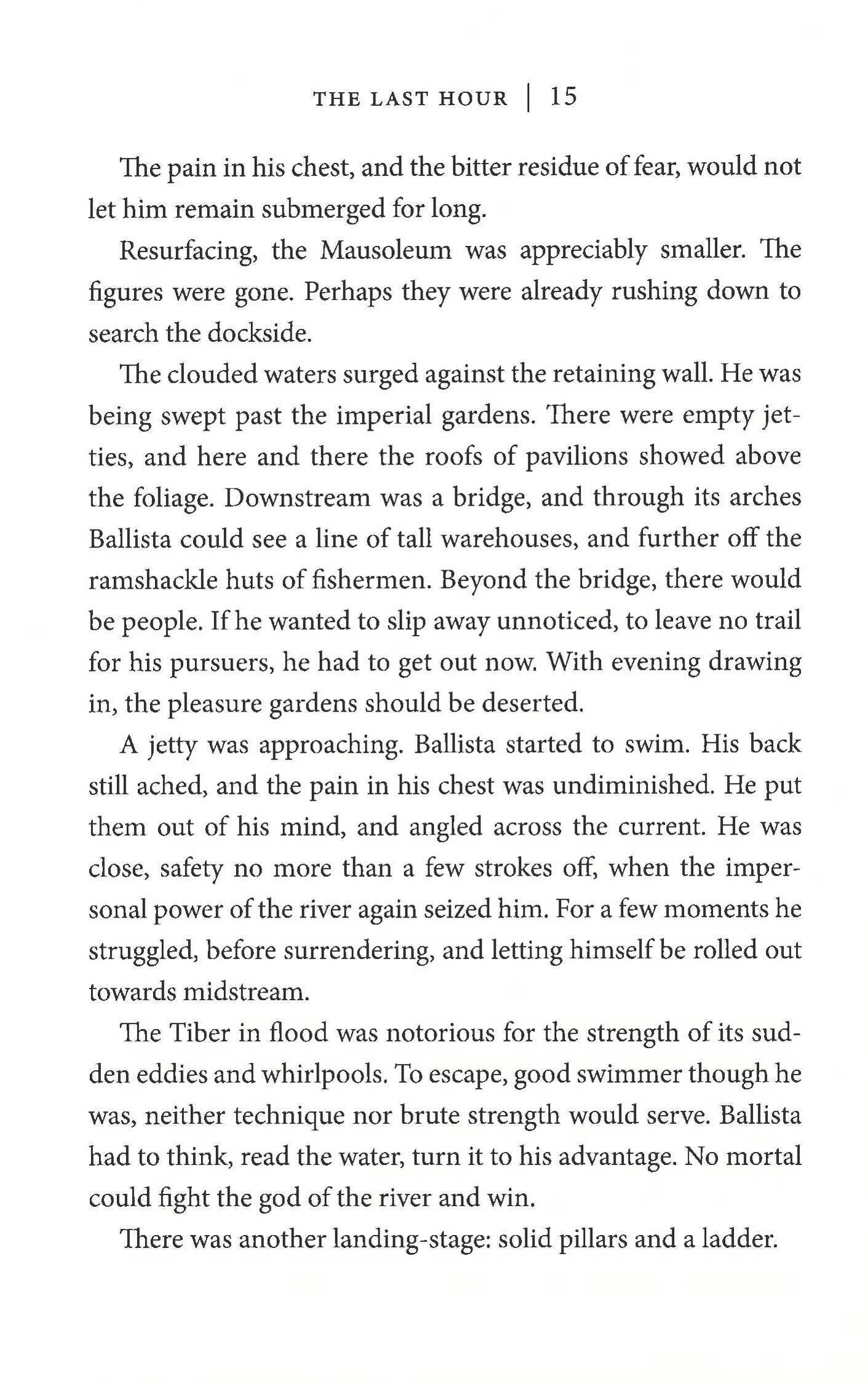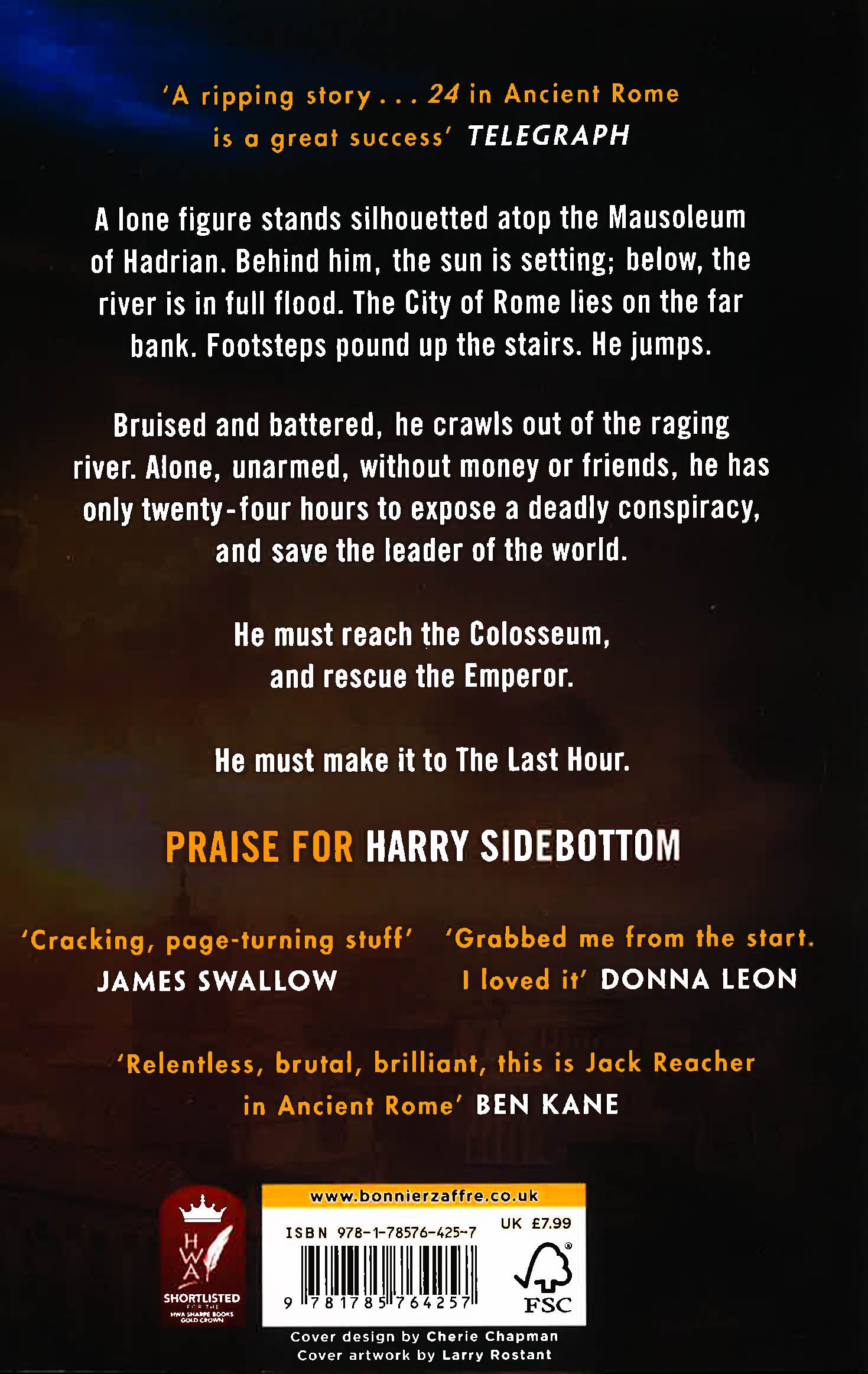 A battle-hardened soldier has just 24 hours to expose a deadly conspiracy at the heart of the Roman Empire in this brilliantly gripping historical thriller from Sunday Times bestseller and Ancient Rome expert, Harry Sidebottom.________________________ A lone figure stands silhouetted atop the Mausoleum of Hadrian. Behind him, the sun is setting over the centre of the known world. Far below, the river is in full flood. The City of Rome lies spread out before him on the far bank. Footsteps pound up the stairs. He's been set up. An enemy is closing in; he is cornered. He jumps.Bruised and battered, he crawls out of the raging river. He is alone and unarmed, without money or friends, trapped in a deadly conspiracy at the heart of the Empire. The City Watch has orders to take him alive; other, more sinister, forces want him dead. As the day dies, he realises he has only 24 hours to expose the conspirators, and save the leader of the world. If the Emperor dies, chaos and violence will ensue. If the Emperor dies, every single person he loves will die.He must run, bluff, hide and fight his way across the Seven Hills. He must reach the Colosseum, and the Emperor. He must make it to The Last Hour.Kiefer Sutherland's 24 meets Gladiator in this breathless historical thriller - for fans of Bernard Cornwell, Ben Kane, Simon Scarrow and Conn Iggulden.________________________Praise for The Last Hour and Harry Sidebottom:'An amazing story of bloodlust, ruthless ambition and revenge' - The Times 'Relentless, brutal, brilliant, this is Jack Reacher in ancient Rome' - Ben Kane'Epic' - Mary Beard'A ripping story...this transplanting of 24 to Ancient Rome is a great success' - Daily Telegraph 'A cracking tale. More twists and turns than the Tiber itself' - Rory Clements'An extraordinarily vivid take on the ancient world' - Evening Standard 'Grabbed me from the start. I loved it' - Donna Leon'The best sort of red-blooded historical fiction' - Andrew Taylor
