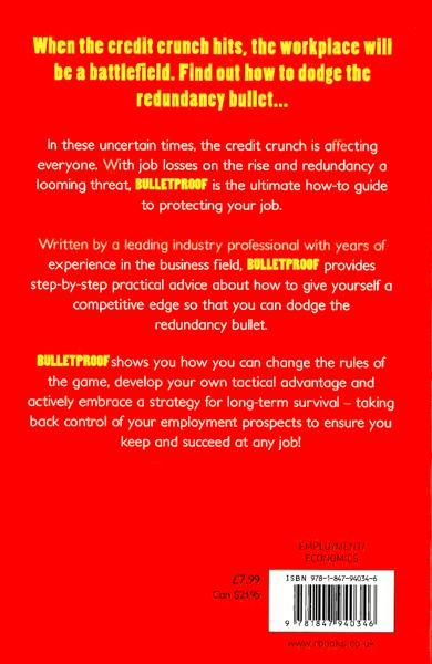 In these uncertain times, the credit crunch is affecting everyone.With job losses on the rise and redundancy a looming threat, Bulletproof is the ultimate how-to guide to protecting your job. Written by a leading industry professional with years of experience in the business field, Bulletproof provides step-by-step practical advice about how to give yourself a competitive edge so that you can dodge the redundancy bullet. Bulletproof shows you how you can change the rules of the game, develop your own tactical advantage and actively embrace a strategy for long term survival - taking back control of your employment prospects to ensure you keep and succeed at any job!