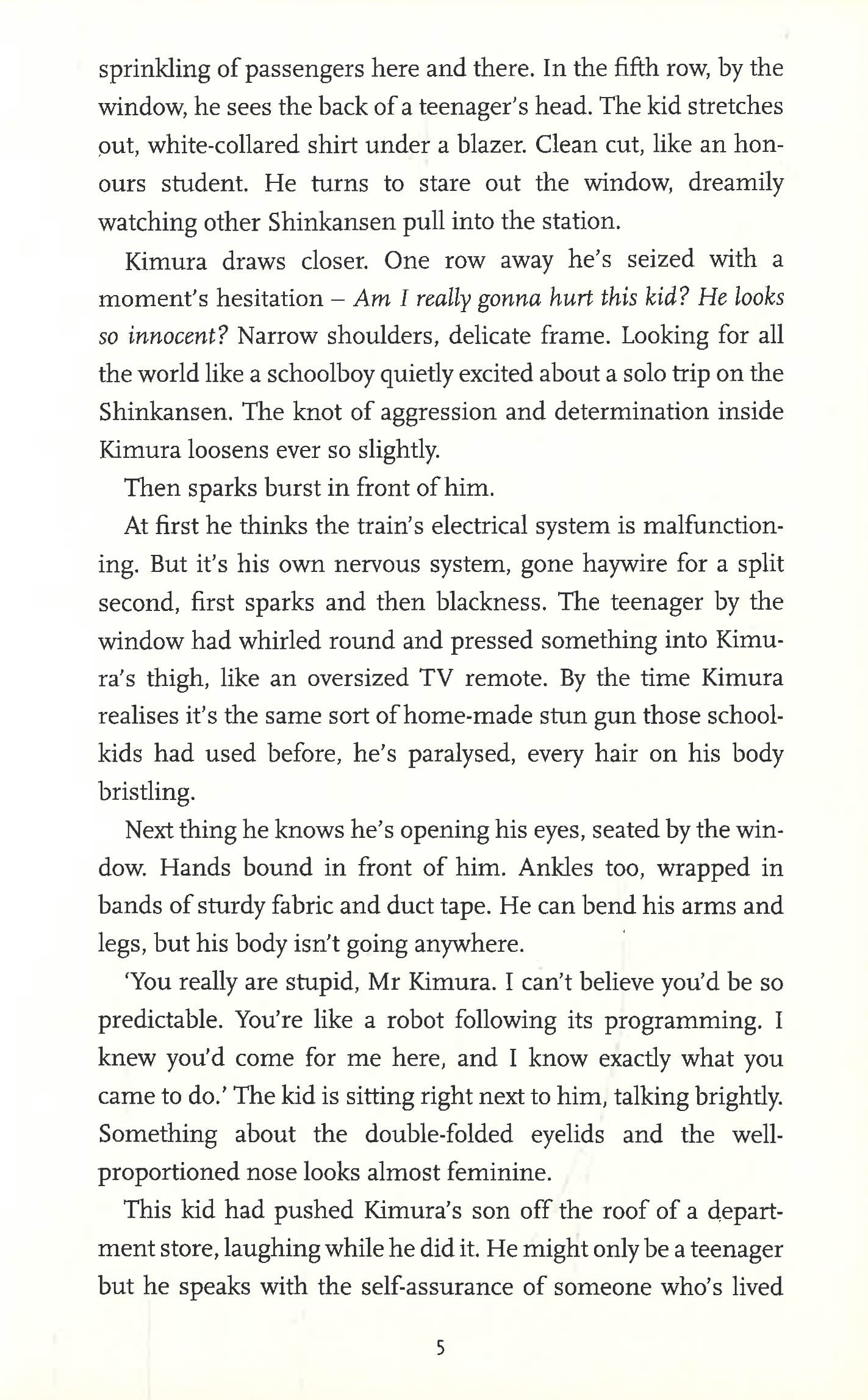 Satoshi looks like an innocent schoolboy but he is really a viciously cunning psychopath. Kimura's young son is in a coma thanks to him, and Kimura has tracked him onto the bullet train heading from Tokyo to Morioka to exact his revenge. But Kimura soon discovers that they are not the only dangerous passengers onboard.