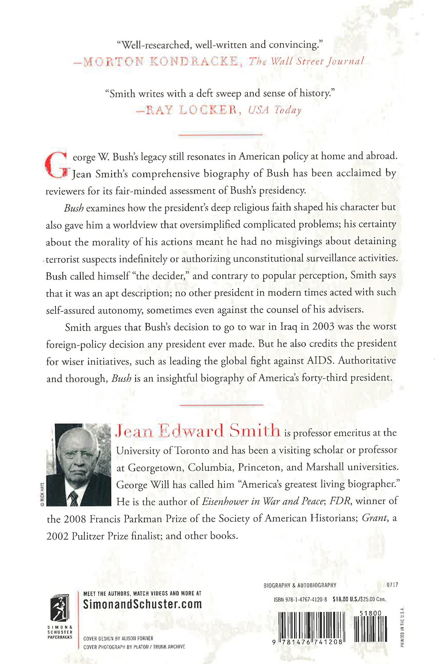 Washington Post Notable Nonfiction Book of the Year Distinguished presidential biographer Jean Edward Smith offers a "comprehensive and compelling" (The New York Times) life of George W. Bush, showing how he ignored his advisors to make key decisions himself--most disastrously in invading Iraq--and how these decisions were often driven by the President's deep religious faith. George W. Bush, the forty-third president of the United States, almost singlehandedly decided to invade Iraq. It was possibly the worst foreign-policy decision ever made by a president. The consequences dominated the Bush Administration and still haunt us today. In Bush, a "well-rounded portrait...necessary and valuable in this election year" (Christian Science Monitor), Jean Edward Smith demonstrates that it was not Dick Cheney, Donald Rumsfeld, or Condoleezza Rice, but President Bush himself who took personal control of foreign policy. Bush drew on his deep religious conviction that important foreign-policy decisions were simply a matter of good versus evil. Domestically, he overreacted to 9/11 and endangered Americans' civil liberties. Smith explains that it wasn't until the financial crisis of 2008 that Bush finally accepted expert advice. As a result, he authorized decisions that saved the economy from possible collapse, even though some of those decisions violated Bush's own political philosophy. "An excellent initial assessment of a presidency that began in controversy...and ended with the international and domestic failures that saddled Bush with the most sustained negative ratings of any modern president" (Dallas Morning News), this comprehensive evaluation will surely surprise many readers. "Written in sober, smooth, snark-free prose, with an air of thoughtful, detached authority, the book is nonetheless exceedingly damning in its judgments about George W. Bush's years in office" (The Washington Post). *This book may have remainder mark.