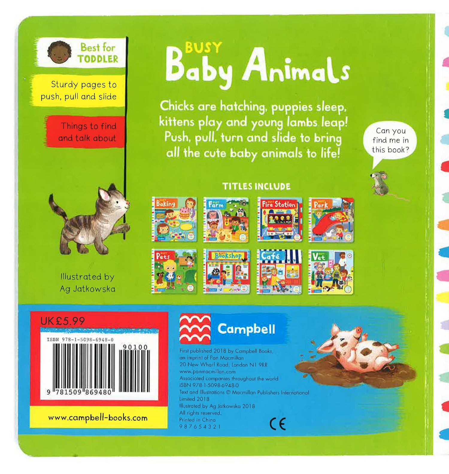 Meet lots of cute new arrivals in Busy Baby Animals, from lambs and piglets to ducklings and kittens. Young children can join in by pushing, pulling and turning the tabs to really bring the baby animals to life!Little ones will love playing with this bright and colourful board book with gentle rhyming text and wonderful illustrations by Ag Jatkowska, which is part of the popular Busy Book series.Discover more animals in the Busy Book series: Busy Farm, Busy Zoo, and Busy Pets.