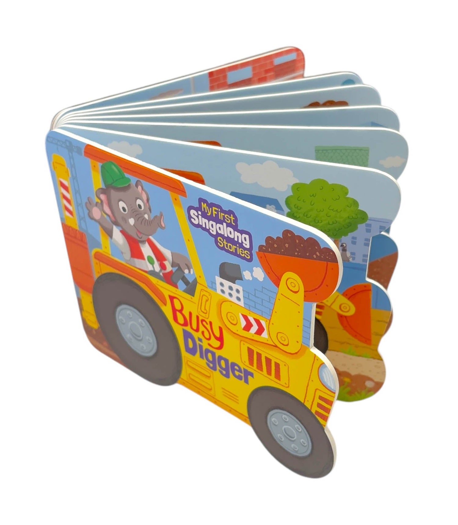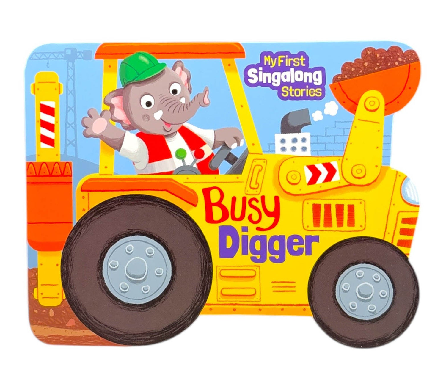 Young children can join in with the reading and singing fun as they read the rhyming words and singalong to the tune of "Wheels on the Bus" nursery rhyme. This digger-shaped chunky board book has sturdy card pages, perfect for little hands to read and turn as they spot the busy animal characters and digger hard at work on the construction site.