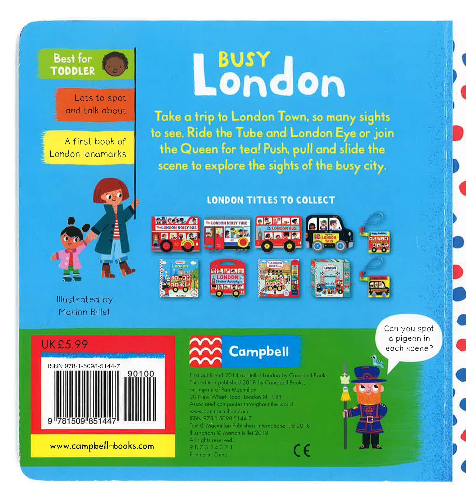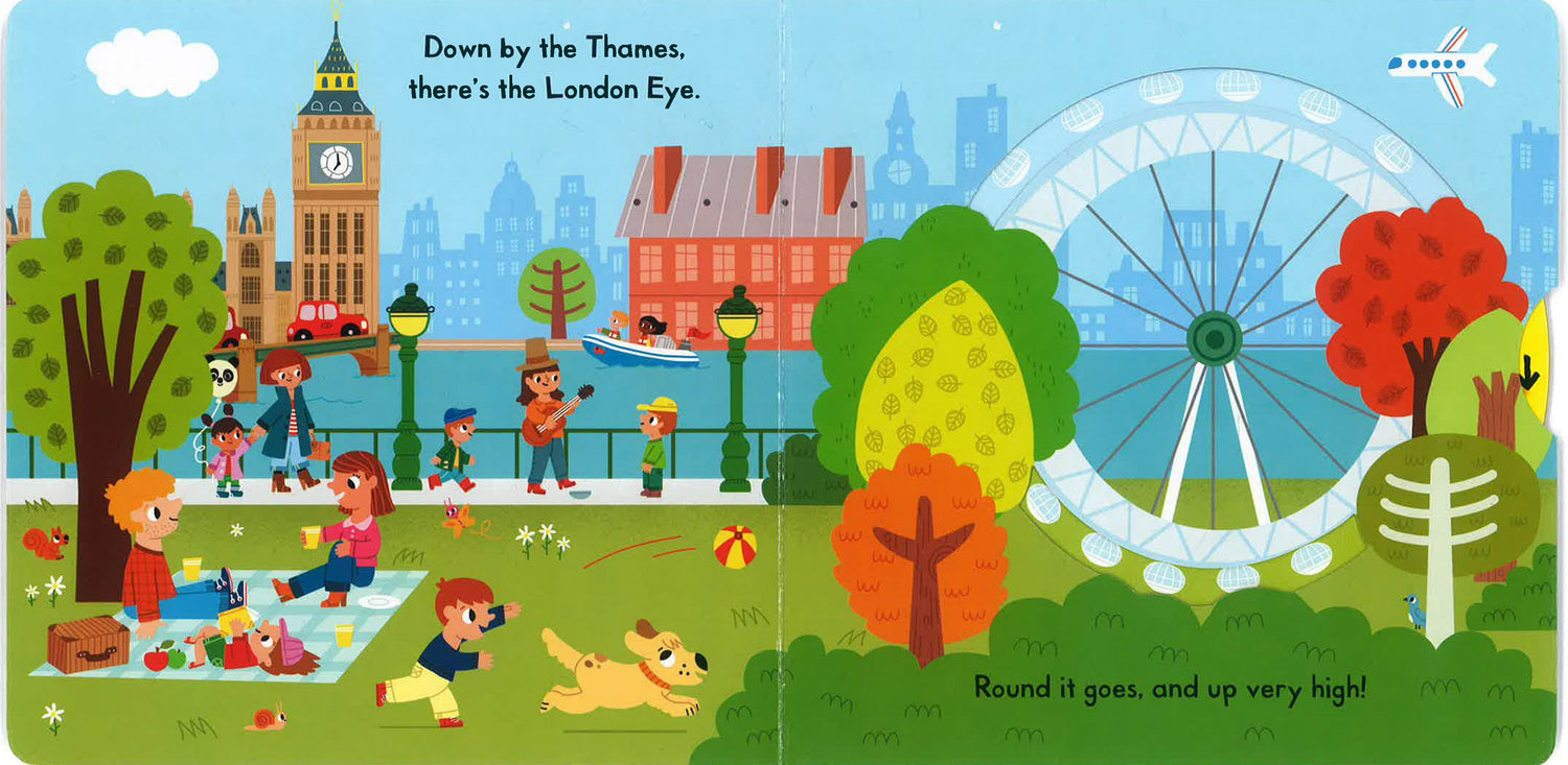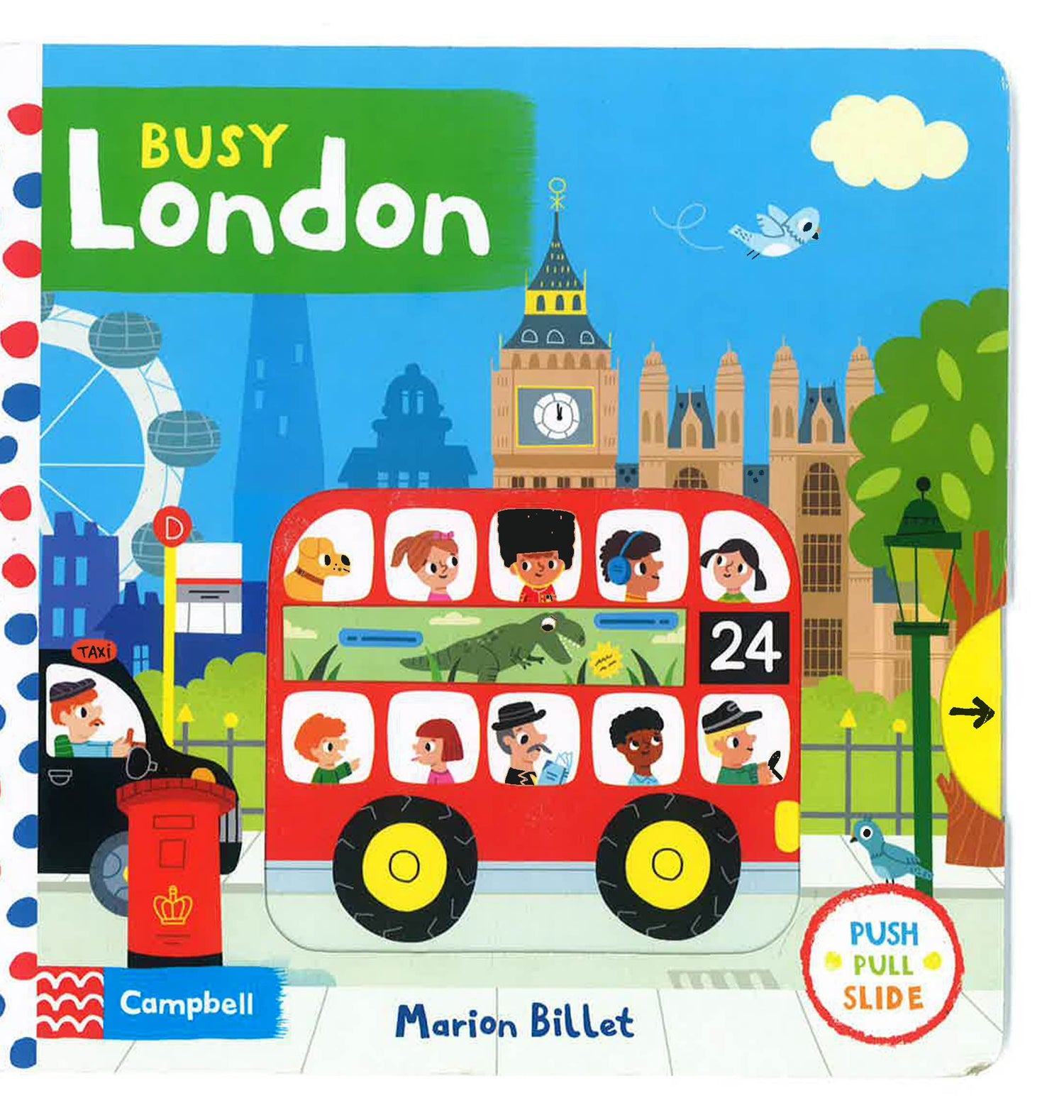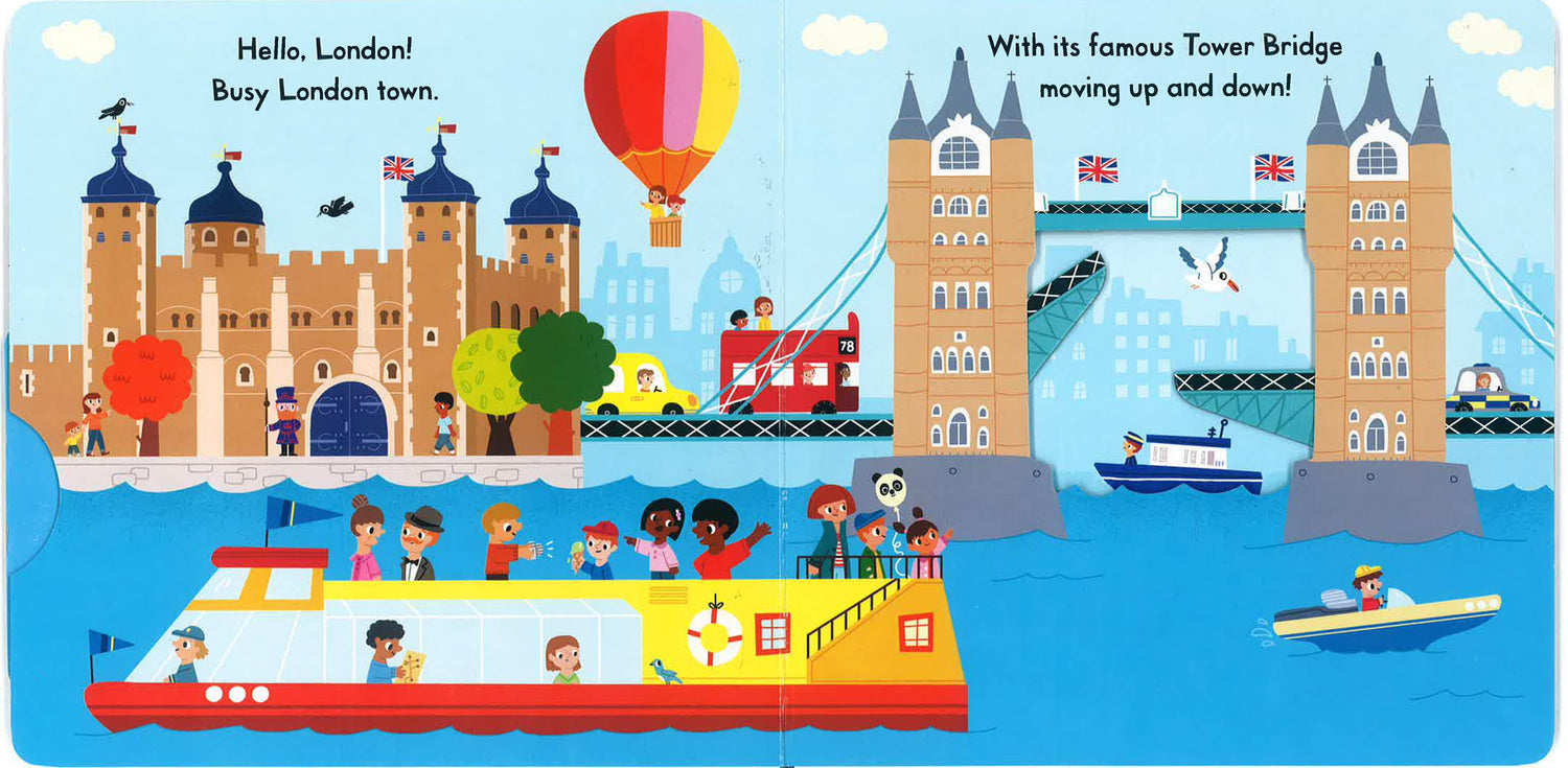Push, pull and slide the London scenes to explore the sights of the busy city: turn the London Eye, open and close Tower Bridge, even control the train doors of the London Underground!Busy London is a bright board book with easy-to-use mechanisms that are designed for toddlers. The colourful illustrations are packed with detail and things to spot, making it the perfect introduction to London, and a great way to share memories of a first visit.From Marion Billet, the illustrator of the popular Campbell London series.Collect more London titles for little explorers: My First London Bus, My First London Taxi, and The London Noisy Book.