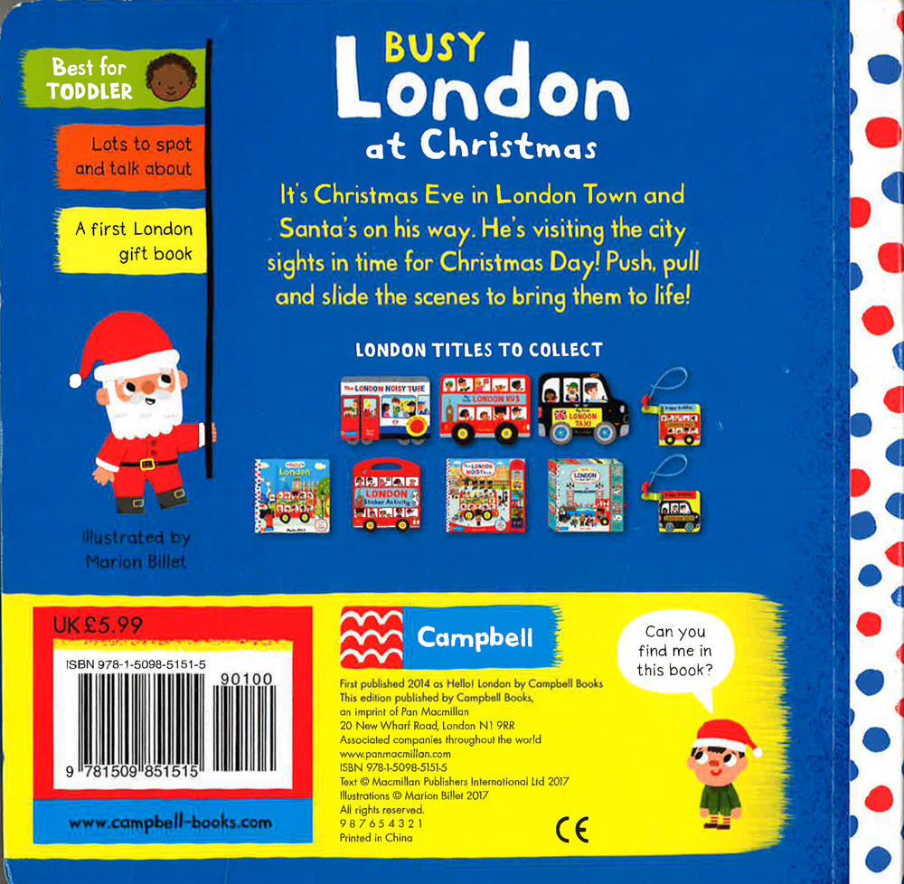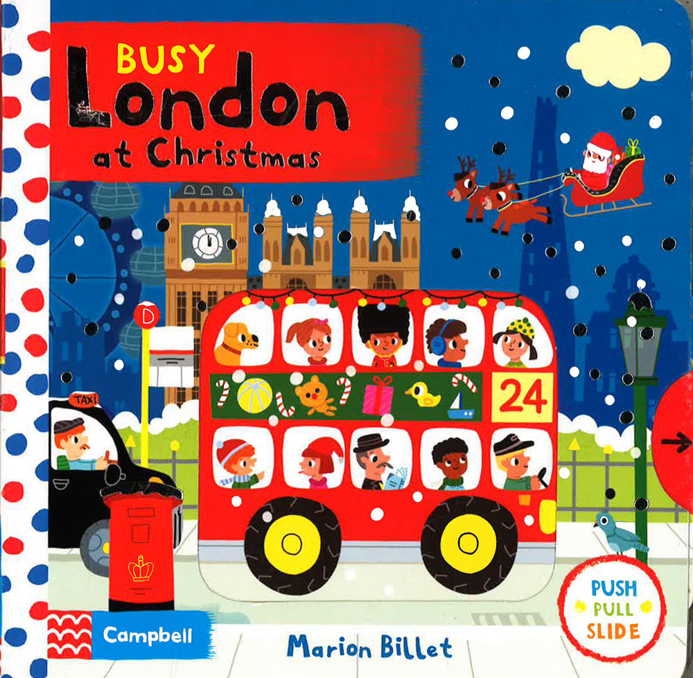 A first novelty board book of Santa's journey through London at Christmas, with push, pull and slide mechanisms for little hands! It's Christmas in London! Push, pull and slide the London scenes to explore the sights of the busy city. Turn the London Eye or open Tower Bridge while Santa makes his way through the snowy city. Look out for him amongst the Christmas shoppers, carol singers and even a snowman. There's even a very special visitor to Buckingham Palace!Busy London at Christmas is a big, bright board book with easy-to-use mechanisms that are designed for toddlers. The colourful illustrations are packed with detail and things to spot, making it the perfect introduction to Christmas in London.From Marion Billet, the illustrator of the popular Campbell London series.London titles to collect: My First London Bus, My First London Taxi, Hello! London, My First London Sticker Book, The London Noisy Book, My Big London Play Set., The London Noisy Tube, Busy London at Christmas and Busy London