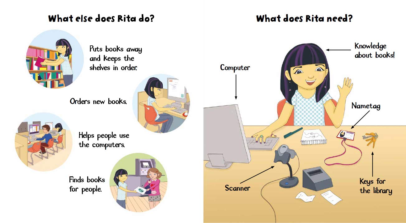Rita is a librarian. She loves working at the library. Lots of people visit every day to learn something new, research something old, or to read for fun.
