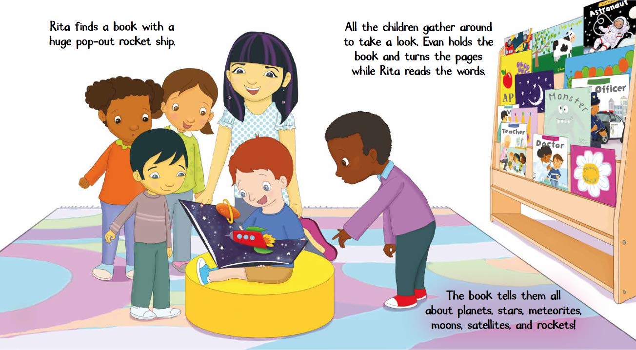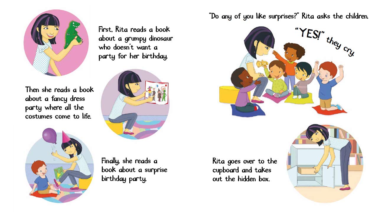The library is 5 years old, and Rita wants to organise a party to help celebrate! In the course of her day, she also finds the perfect story for each child to help them enjoy reading.