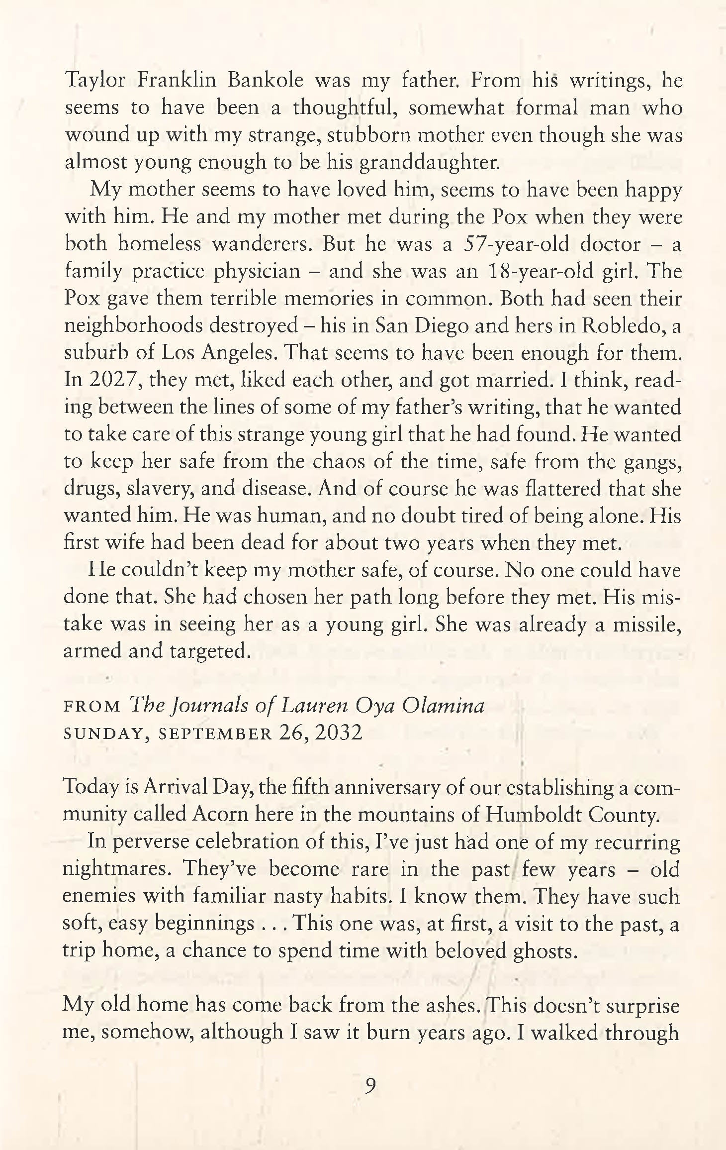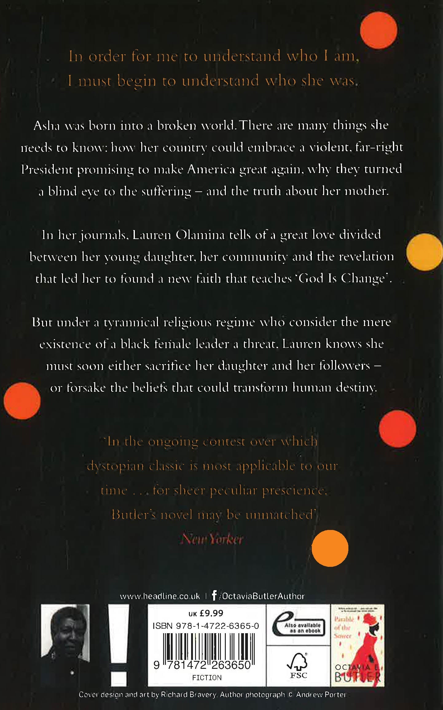 In her journals, Lauren Olamina tells of a great love divided between her young daughter, her community and the revelation that led her to found a new faith that teaches 'God Is Change'. But under a tyrannical religious regime who consider the mere existence of a black female leader a threat, Lauren knows she must soon either sacrifice her daughter and her followers - or forsake the beliefs that could transform human destiny.