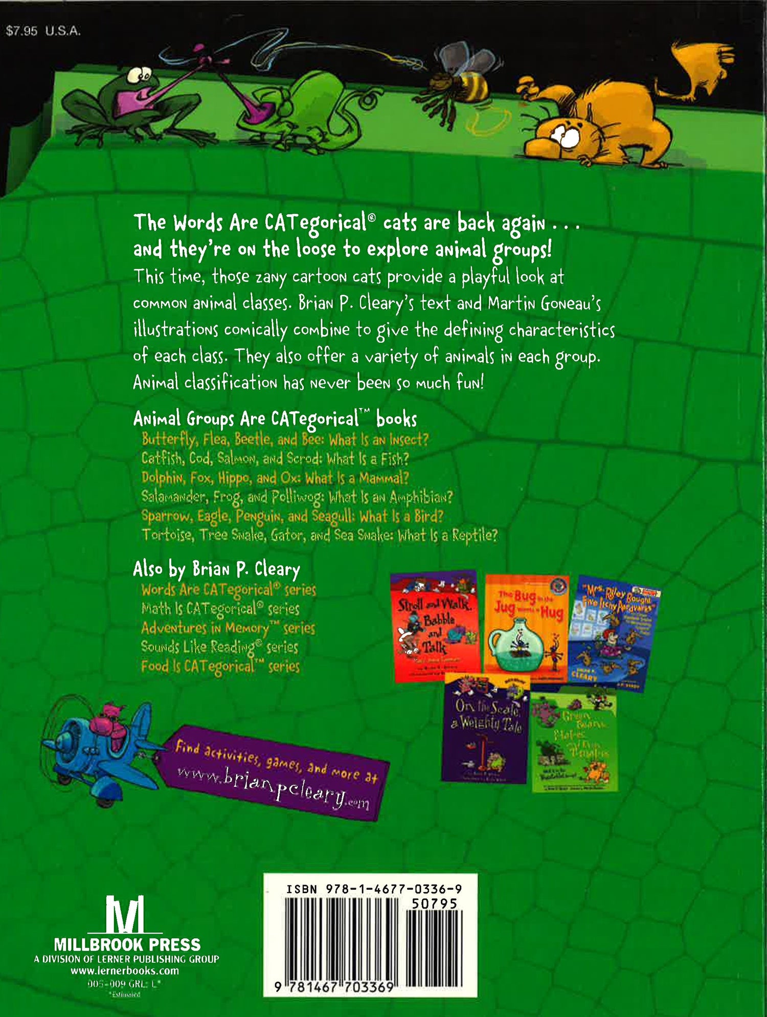 What is an insect? Crickets, mosquitos, ladybugs, and many other creatures are all insects! Clever rhymes from Brian P. Cleary and comical illustrations from Martin Goneau explain the traits that all insects have in common and help you determine which creatures belong in this six-legged group. Animal names are printed in color for easy identification, and the goofy CATegorical cats make learning fun!