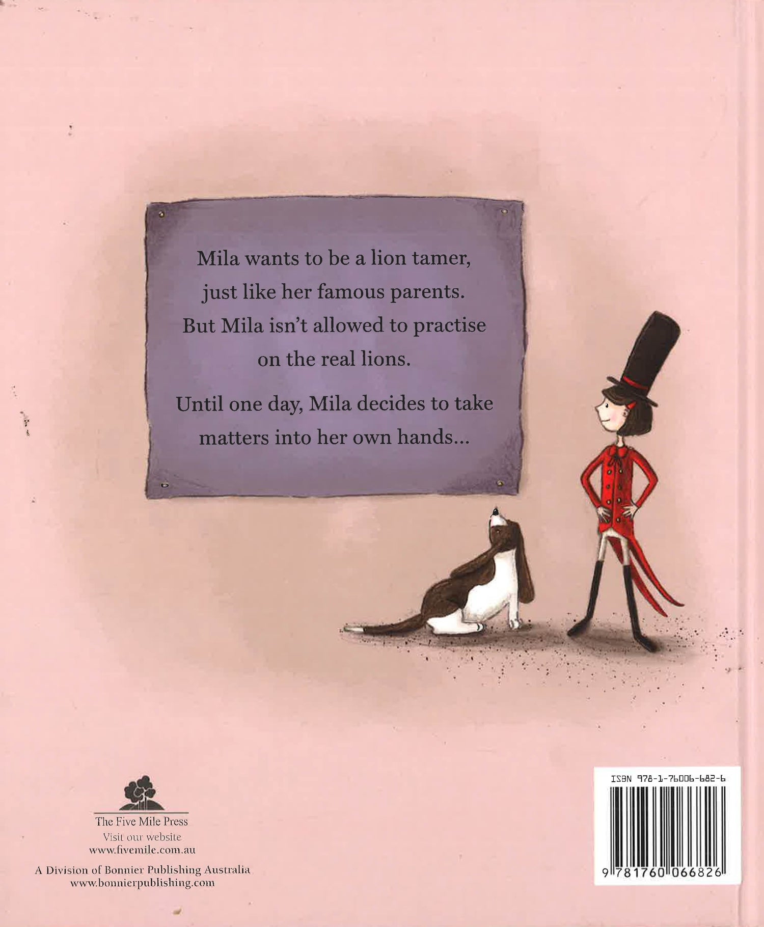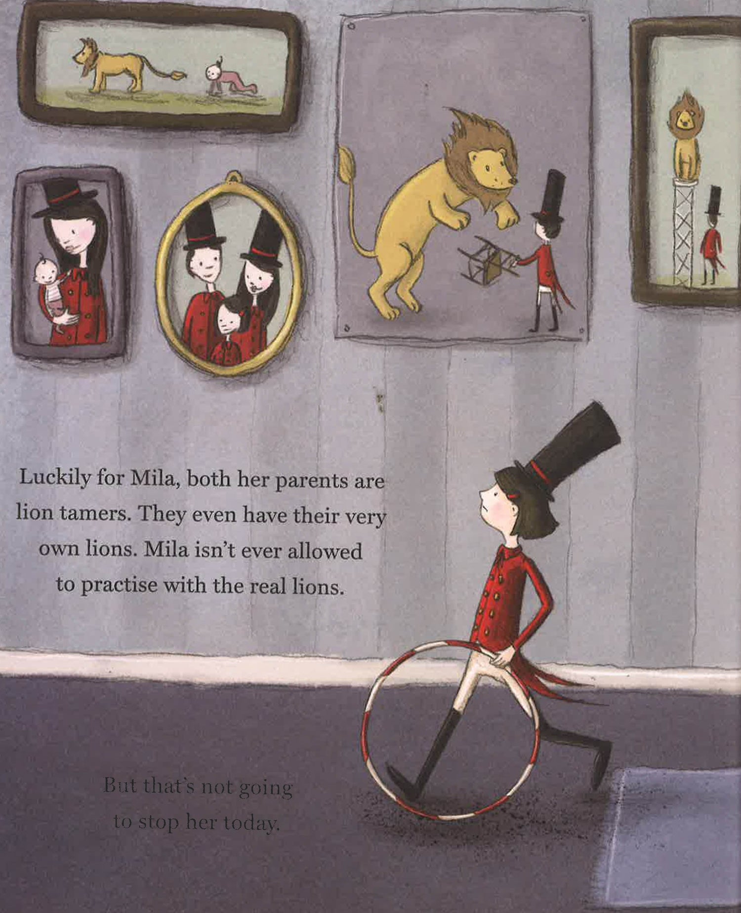 Luckily, Mila’s parents are lion tamers too, they’re part of a circus and they have lions. Mila isn’t allowed to tame the real lions, but she’s going to try anyway. When she opens the gate to the lions’ cage to slip in they slip out. Quite casually. They have sharp teeth and pointy claws. This could be a problem.