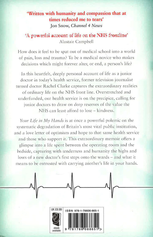 THE SUNDAY TIMES BESTSELLER 'I am a junior doctor. It is 4 a.m. I have run arrest calls, treated life-threatening bleeding, held the hand of a young woman dying of cancer, scuttled down miles of dim corridors wanting to sob with sheer exhaustion, forgotten to eat, forgotten to drink, drawn on every fibre of strength that I possess to keep my patients safe from harm.' How does it feel to be spat out of medical school into a world of pain, loss and trauma that you feel wholly ill-equipped to handle? To be a medical novice who makes decisions which - if you get them wrong - might forever alter, or end, a person's life? In Your Life in My Hands, television journalist turned junior doctor Rachel Clarke captures the extraordinary realities of life on the NHS frontline. During last year's historic junior doctor strikes, Rachel was at the forefront of the campaign against the government's imposed contract upon young doctors. Her heartfelt, deeply personal account of life as a junior doctor in today's NHS is both a powerful polemic on the degradation of Britain's most vital public institution and a love letter of optimism and hope to that same health service.