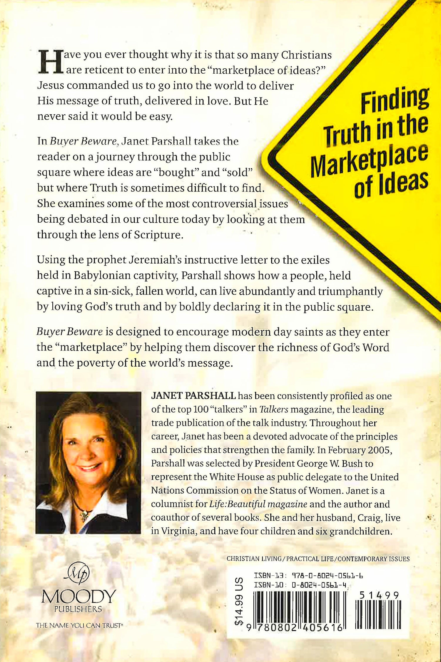 In Buyer Beware, Janet Parshall takes the reader on a journey through the public square where ideas are 'bought' and 'sold' but where Truth is sometimes difficult to find. She examines some of the most controversial issues being debated in our culture today, by looking at them through the lens of Scripture.