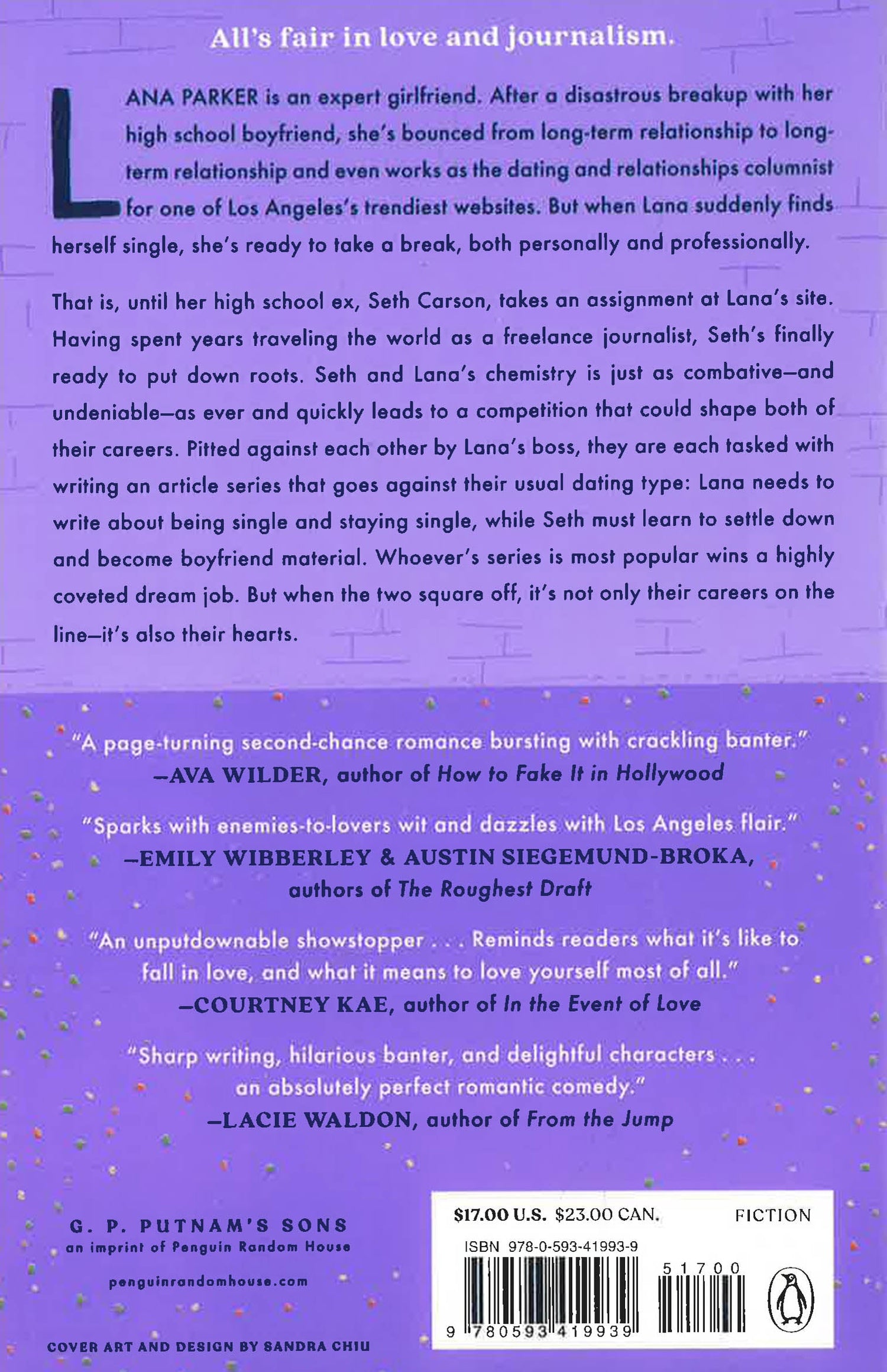That is, until her high school ex, Seth Carson, takes an assignment at Lana's site. Having spent years traveling the world as a freelance journalist, Seth's finally ready to put down roots. Seth and Lana's chemistry is just as combative―and undeniable―as ever and quickly leads to a competition that could shape both of their careers. Pitted against each other by Lana's boss, they are each tasked with writing an article series that goes against their usual dating type: Lana needs to write about being single and staying single, while Seth must learn to settle down and become boyfriend material. Whoever's series is most popular wins a highly coveted dream job. But when the two square off, it's not only their careers on the line―it’s also their hearts.