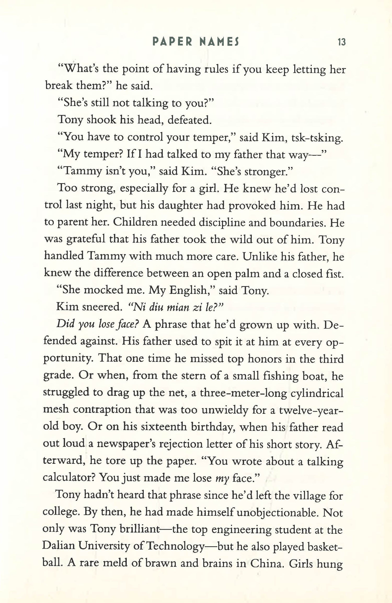Set in New York and China over three decades, Paper Names explores what it means to be American from three different perspectives. There's Tony, a Chinese-born engineer turned Manhattan doorman, who immigrated to the United States to give his family a better life. His daughter, Tammy, who we meet at age nine and follow through adulthood, and who grapples with the expectations of a first generation American and her own personal desires. Finally, there's Oliver, a handsome white lawyer with a dark family secret and who lives in the building where Tony works. A sudden attack causes their lives to intertwine in ways that will change them forever.