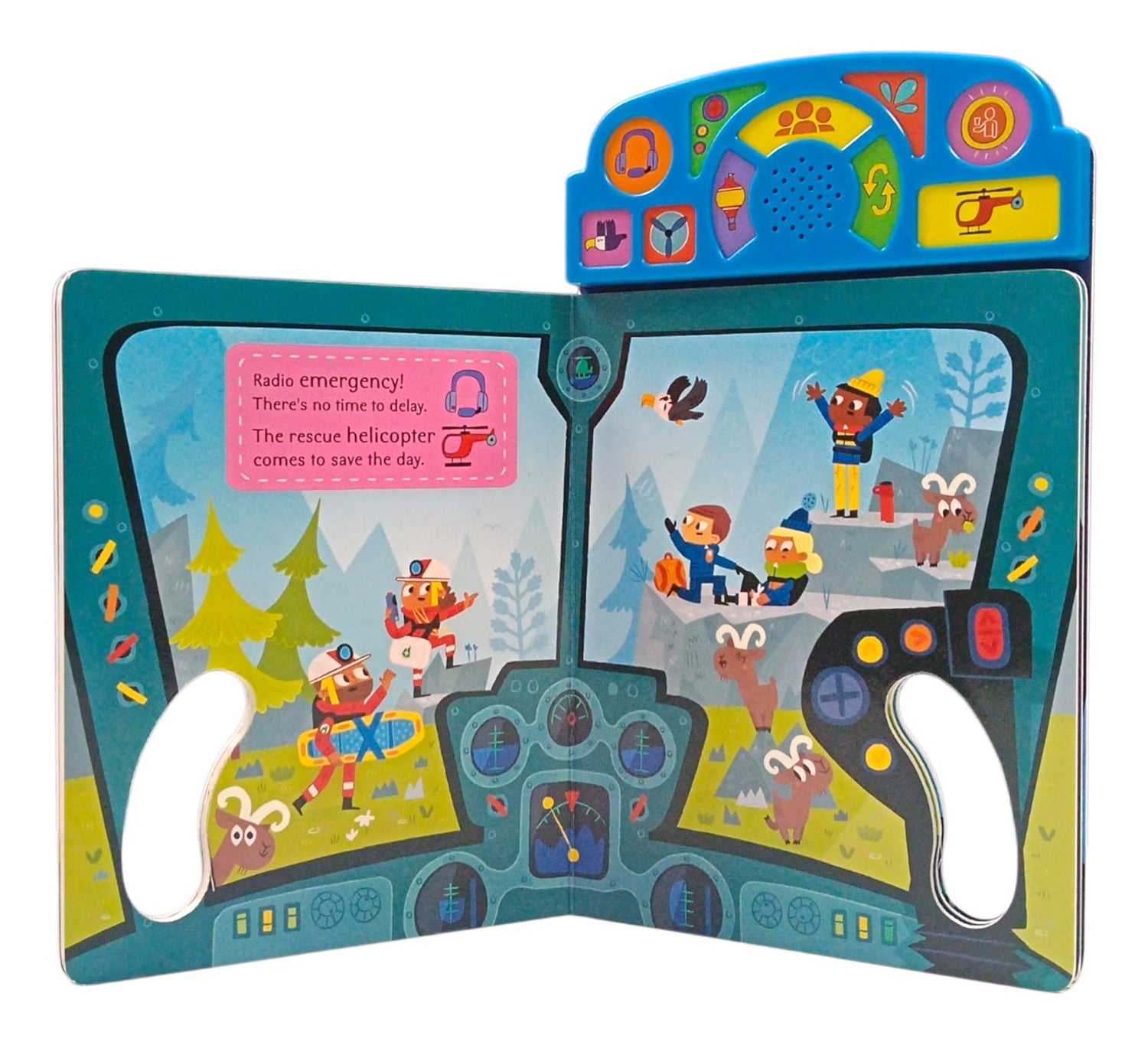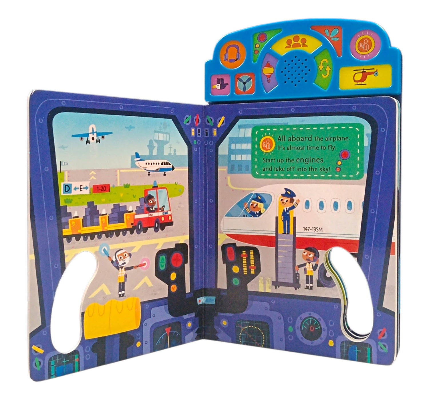 With a fantastic 10-button sound bar and handle-shaped pages, each exciting spread focuses on different vehicles. As well as the die-cut pages, there are two sounds to use on each spread--from an airplane taking off to a stunt plane looping-the-loop, and much more. The two-line rhymes on each page encourage children to get involved and take on the roles of a pilot and astronaut as they fly through the sky.