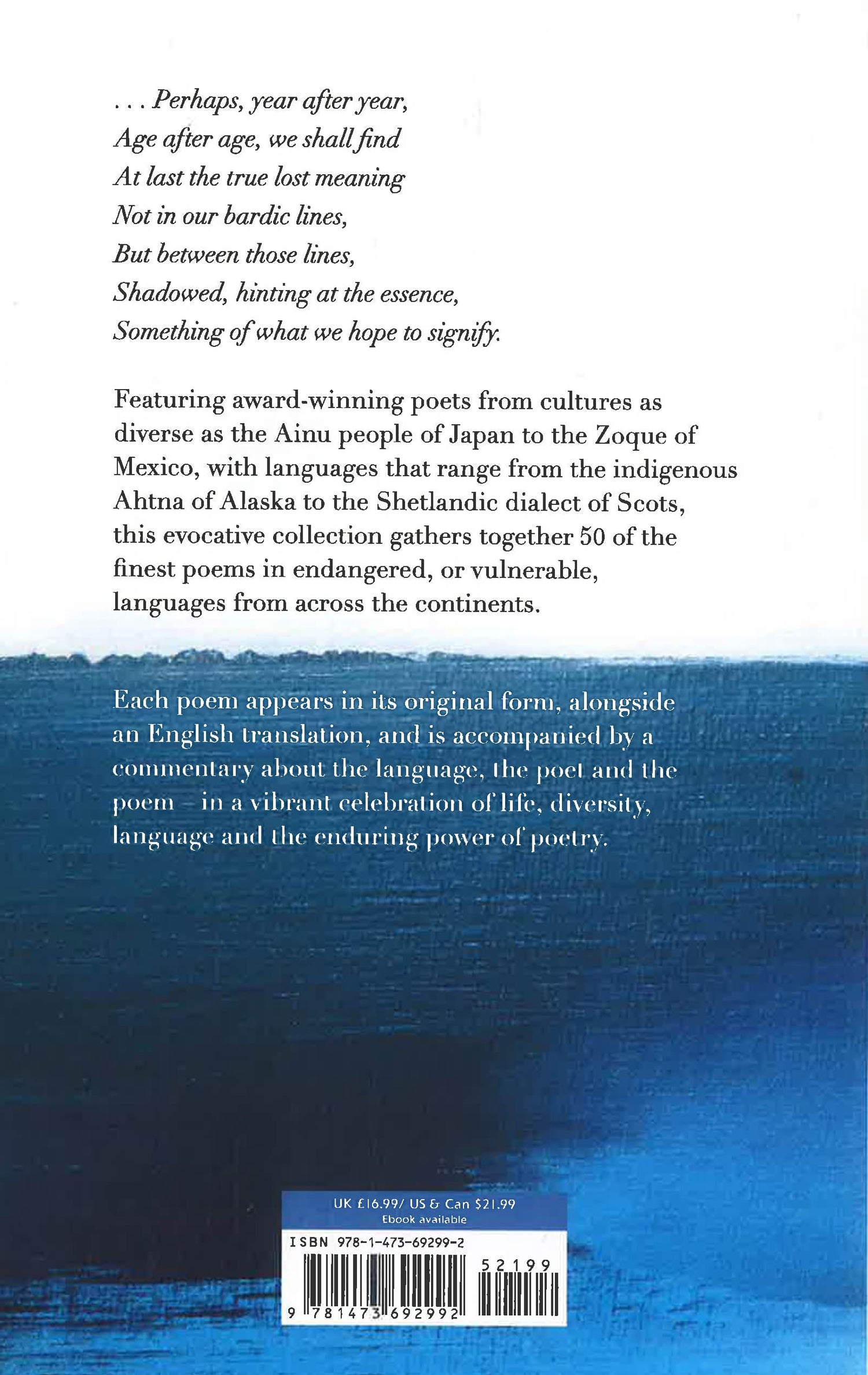 Poems from the Edge of Extinction gathers together 50 poems in languages from around the world that have been identified as endangered; it is a celebration of our linguistic diversity and a reminder of our commonalities and the fundamental role verbal art plays in human life around the world. With poems by influential, award-winning poets such as US poet laureate Joy Harjo, Hawad, Valzhyna Mort, and Jackie Kay, this anthology offers a unique insight into both languages and poetry, taking the reader on an emotional, life-affirming journey into the culture of these beautiful languages.