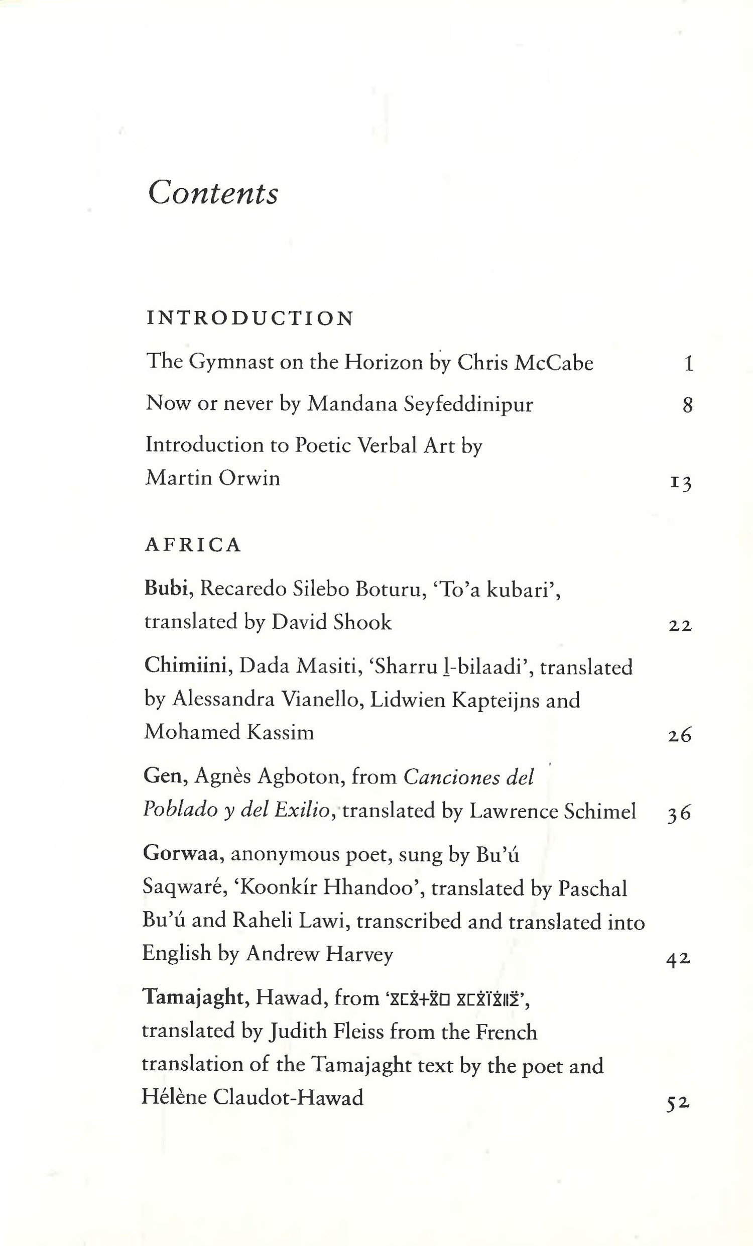 Poets included in the book: Joy Harjo; Hawad; Jackie Kay; Aurélia Lassaque; Nineb Lamassu; Gearóid Mac Lochlainn; Valzhyna Mort; Laura Tohe; Taniel Varoujan; Avrom Sutzkever.