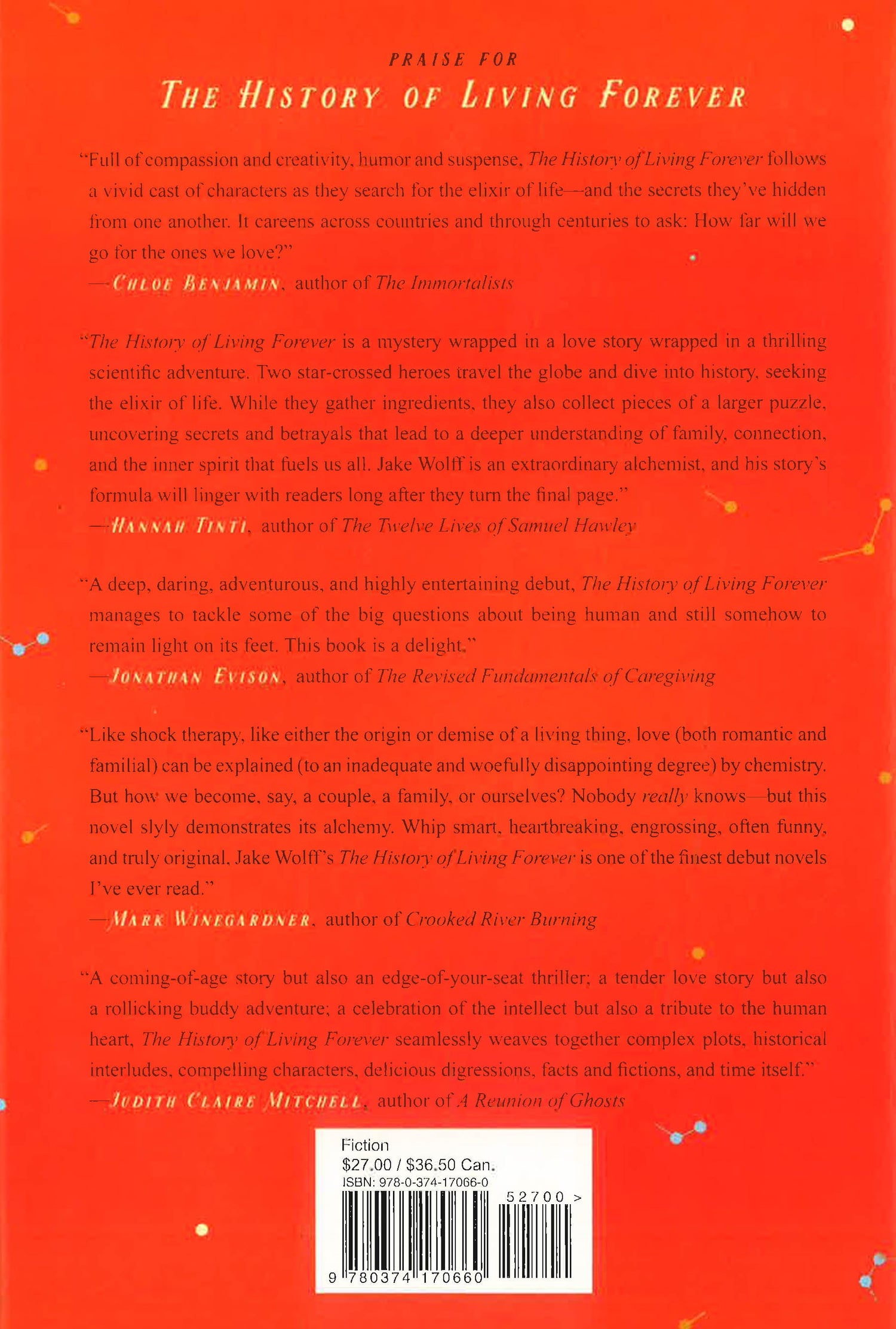 A globe-trotting, century-spanning adventure story, Jake Wolff’s The History of Living Forever takes us from Maine to Romania to Easter Island and introduces a cast of unforgettable characters―drug kingpins, Big Pharma flunkies, centenarians, boy geniuses, and even a group of immortalists masquerading as coin collectors. It takes us deep into the mysteries of life―from first love to first heartbreak, from the long pall of grief to the irreconcilable loneliness of depression to the possibility of medical miracles, from coming of age to coming out. Hilarious, haunting, heart-busting, life-affirming, it asks each of us one of life’s essential questions: How far would you go for someone you love?