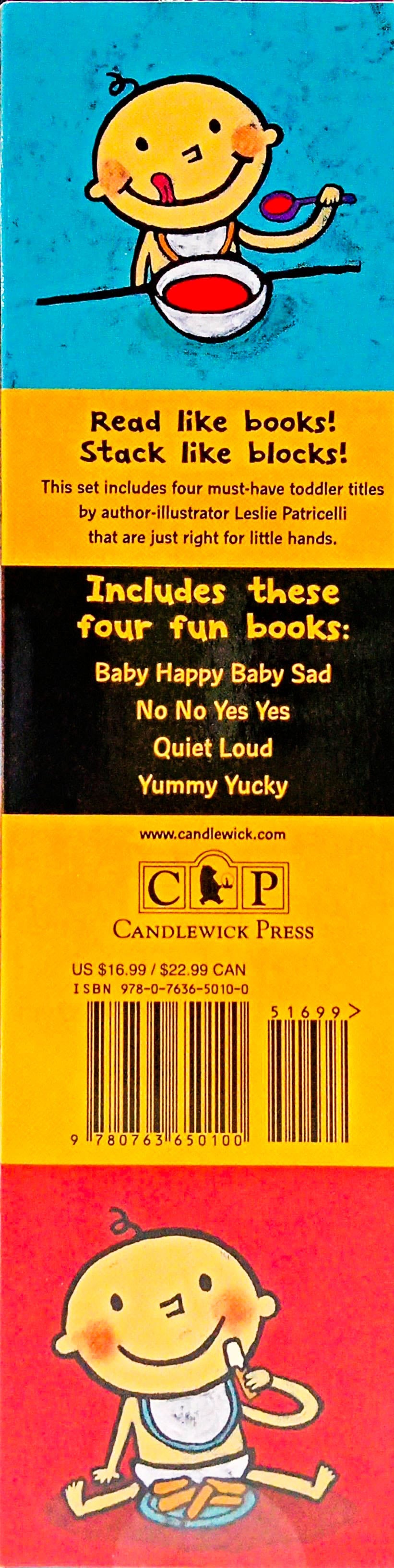 Included in this set is a sampling of Leslie Patricelli’s must-have toddler titles, perfectly sized for little hands. Featured are four fun, chunky books: Baby Happy Baby Sad, No No Yes Yes, Quiet Loud, Yummy Yucky.
