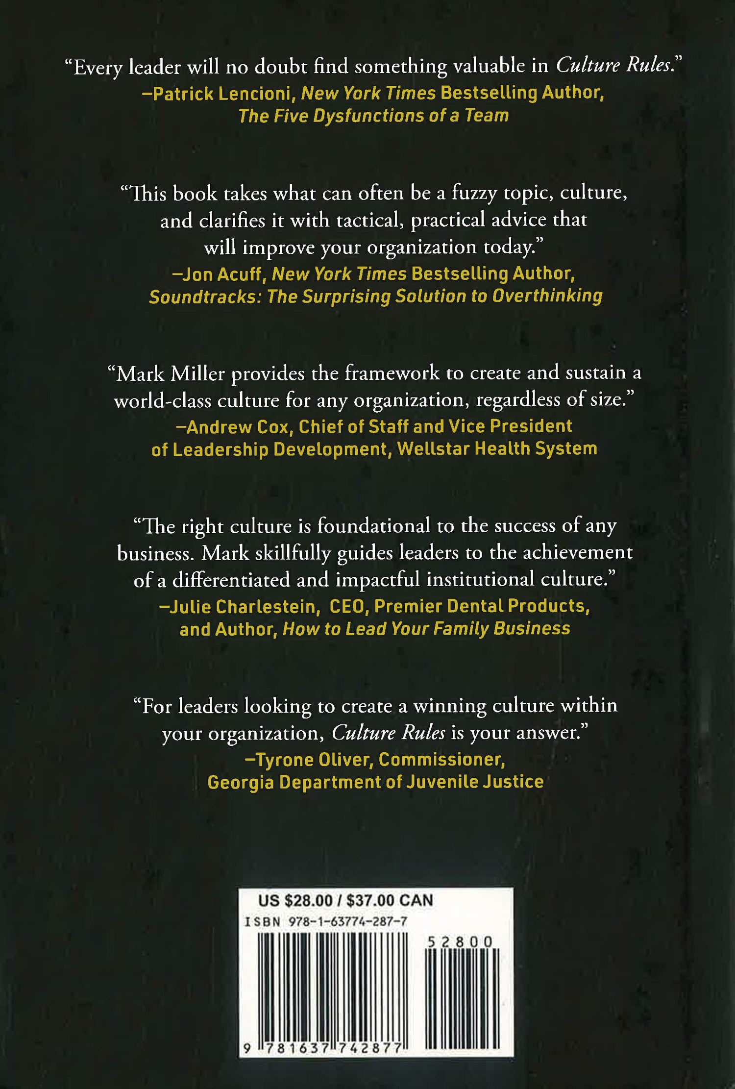 Most important, this book is not just another compilation of case studies. Culture Rules makes the case for why leaders should invest their time and energy on building culture and gives them three simple, actionable rules they must play by if they want to stay in the game and win!