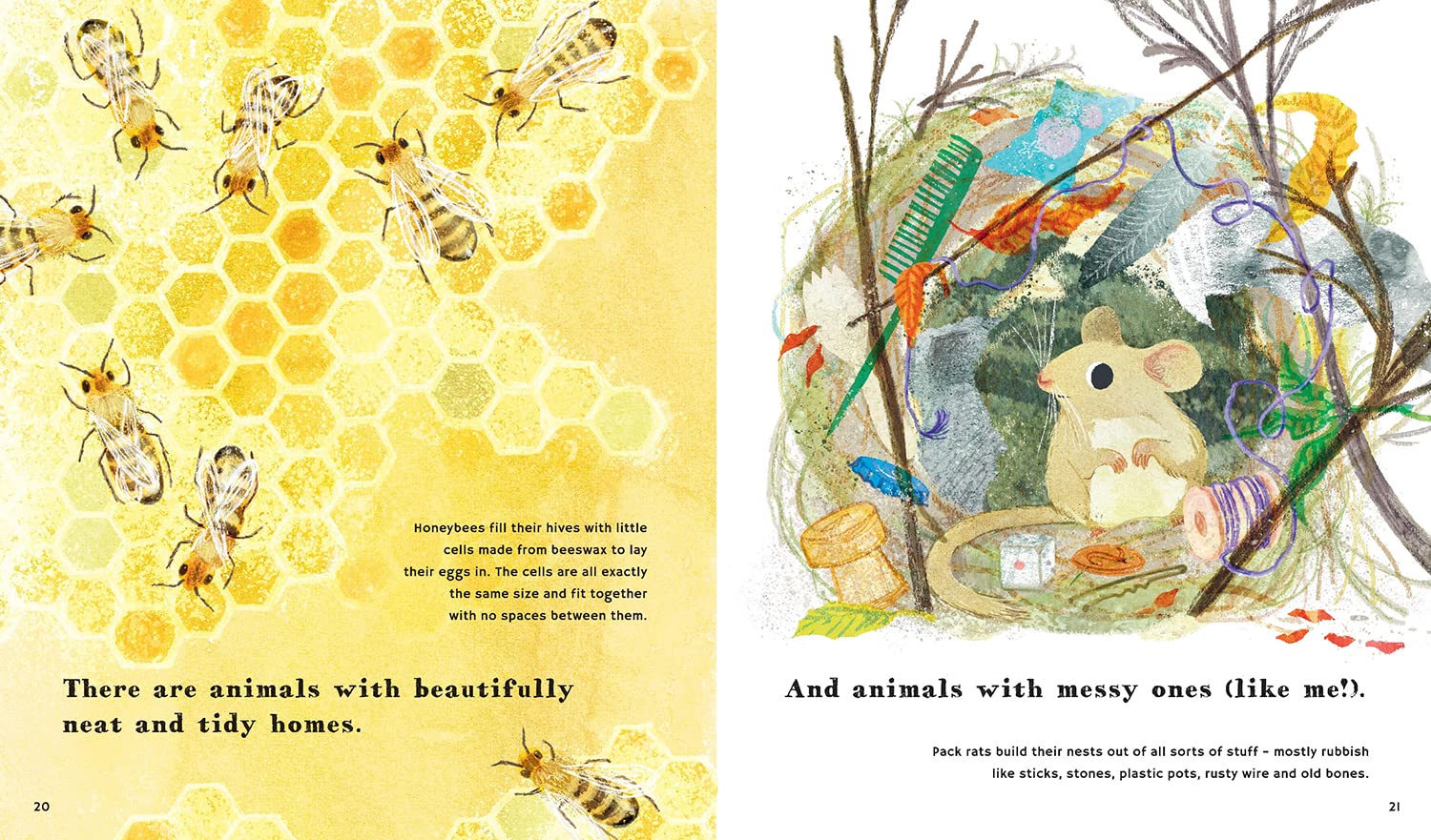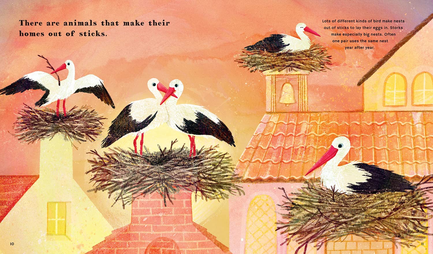 Some animals make houses out of sticks (storks will return to their large twiggy nests year after year). Others build them out of stones (young caddis flies carry their pebbly homes wherever they go). And some—like edible-nest swiftlets—craft houses out of spit! Many animals have homes, but not all animal homes are the same. From honeybees with neat, precise hives to pack rats with messy nests, from prairie dogs whose underground towns last for decades to orangutans who make a new home every day, the range of dwellings depicted here shows how much animals’ behavior can vary, even in their own homes. Melding a simple narration with more detailed facts on such animals as beavers, spiders, polar bears, termites, and reindeer, this appealing picture book also offers a brief note on animals and their homes in the back matter.