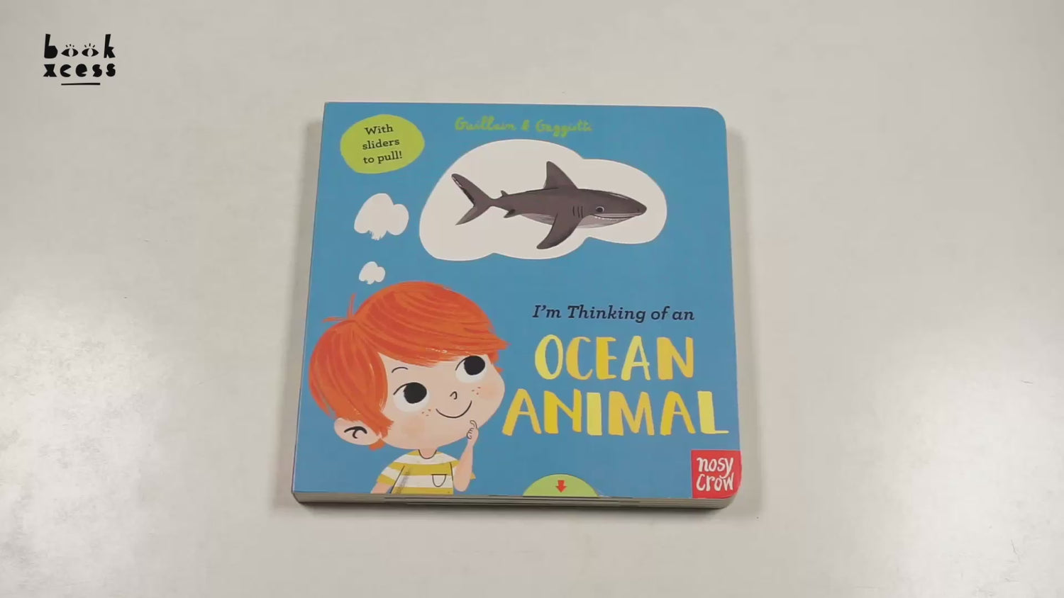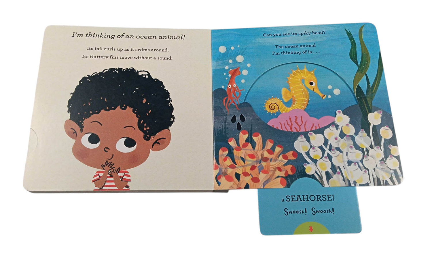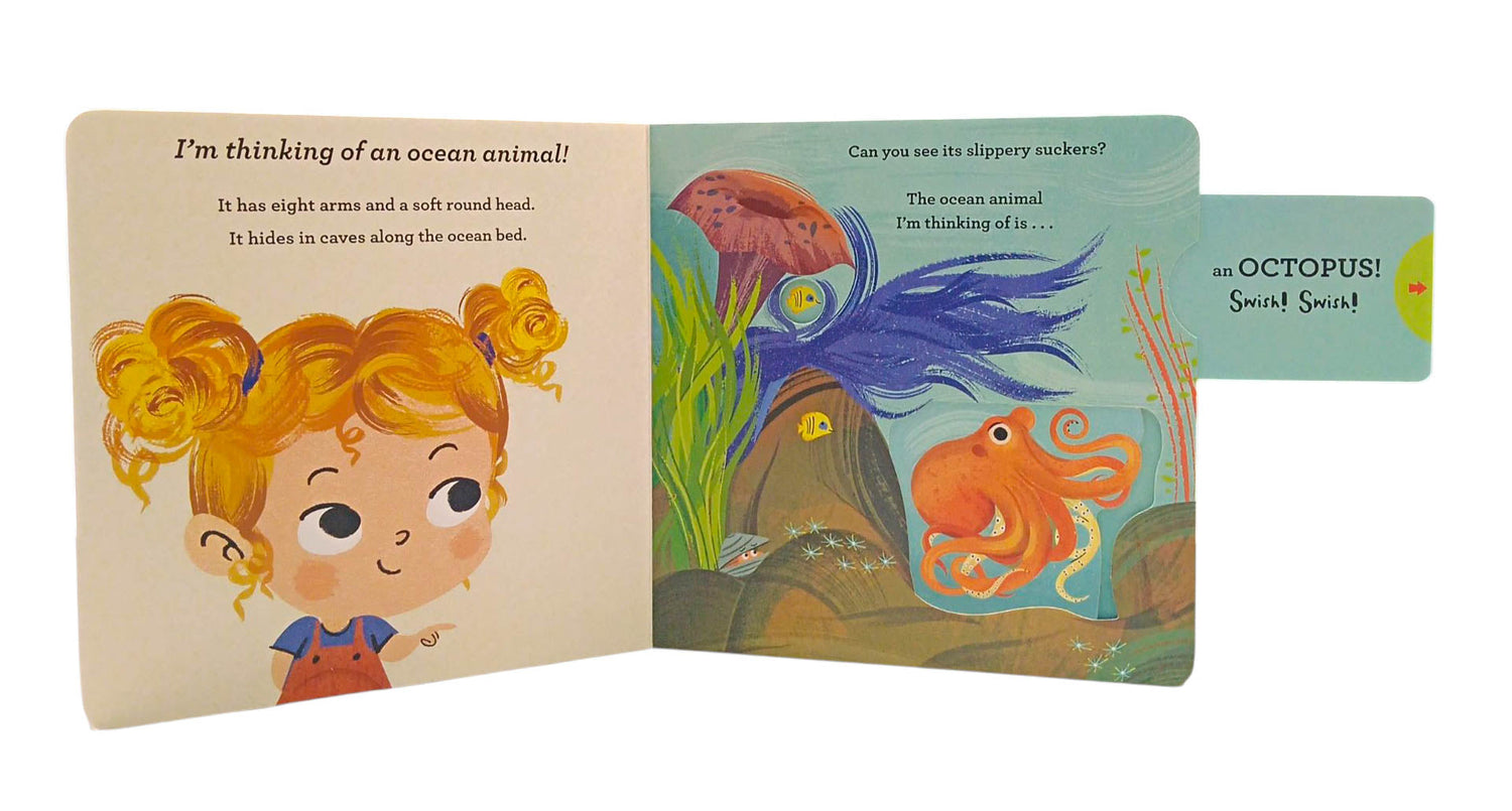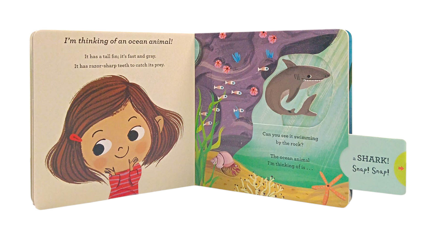 Each child is thinking of an ocean animal. Can you guess which one? Read the clues, make a guess, and pull the slider to reveal the animal hiding in the beautifully illustrated scene.