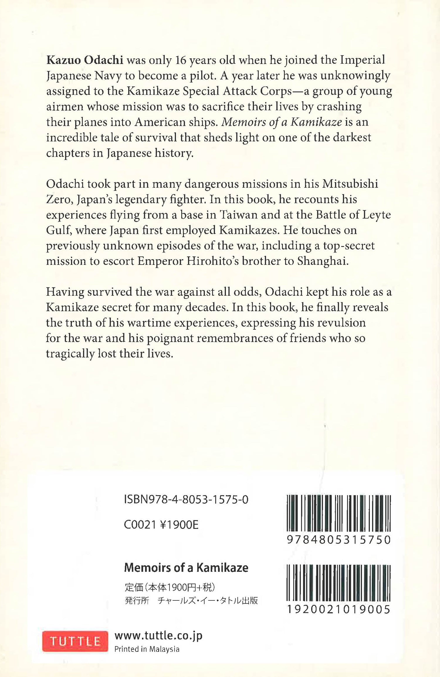 This book tells the story of Kazuo Odachi who—in 1943, when he was just 16 years-old—joined the Imperial Japanese Navy to become a pilot. A year later, he was unknowingly assigned to the Kamikaze Special Attack Corps—a group of airmen whose mission was to sacrifice their lives by crashing planes into enemy ships. Their callsign was "ten dead, zero alive."