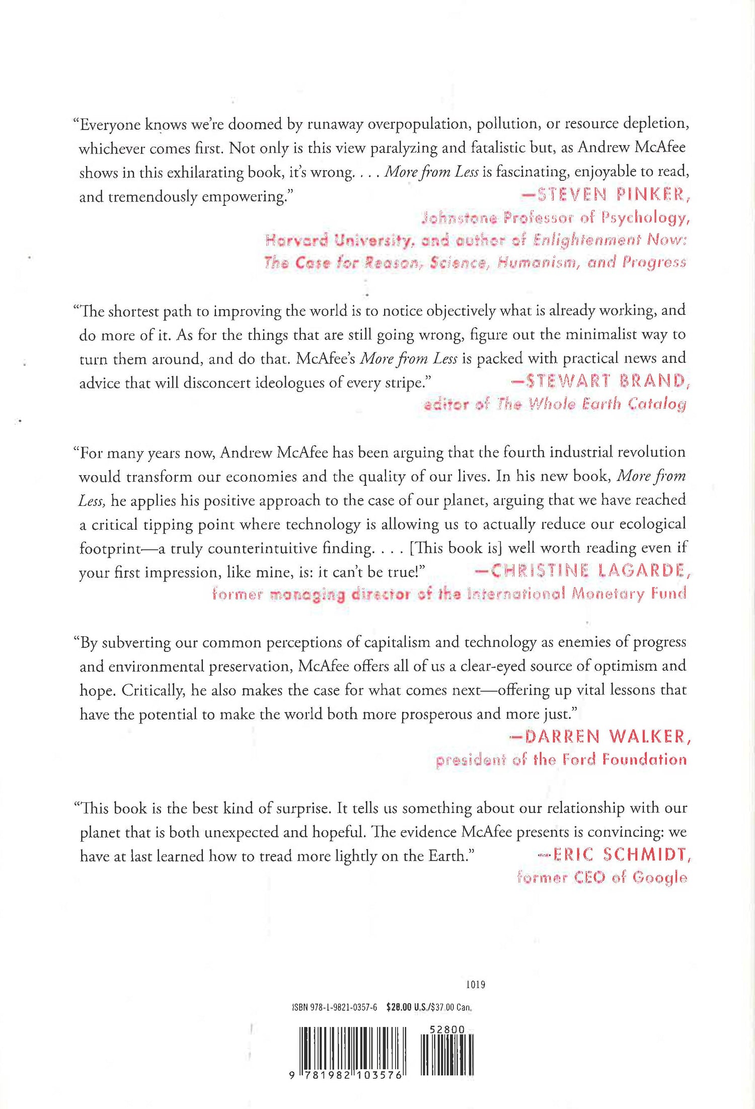 What has made this turnabout possible? One thing, primarily: the collaboration between technology and capitalism, although good governance and public awareness have also been critical. McAfee does warn of issues that haven’t been solved, like global warming, overfishing, and communities left behind as capitalism and tech progress race forward. But overall, More from Less is a revelatory, paradigm-shifting account of how we’ve stumbled into an unexpectedly better balance with nature—one that holds out the promise of more abundant and greener centuries ahead.