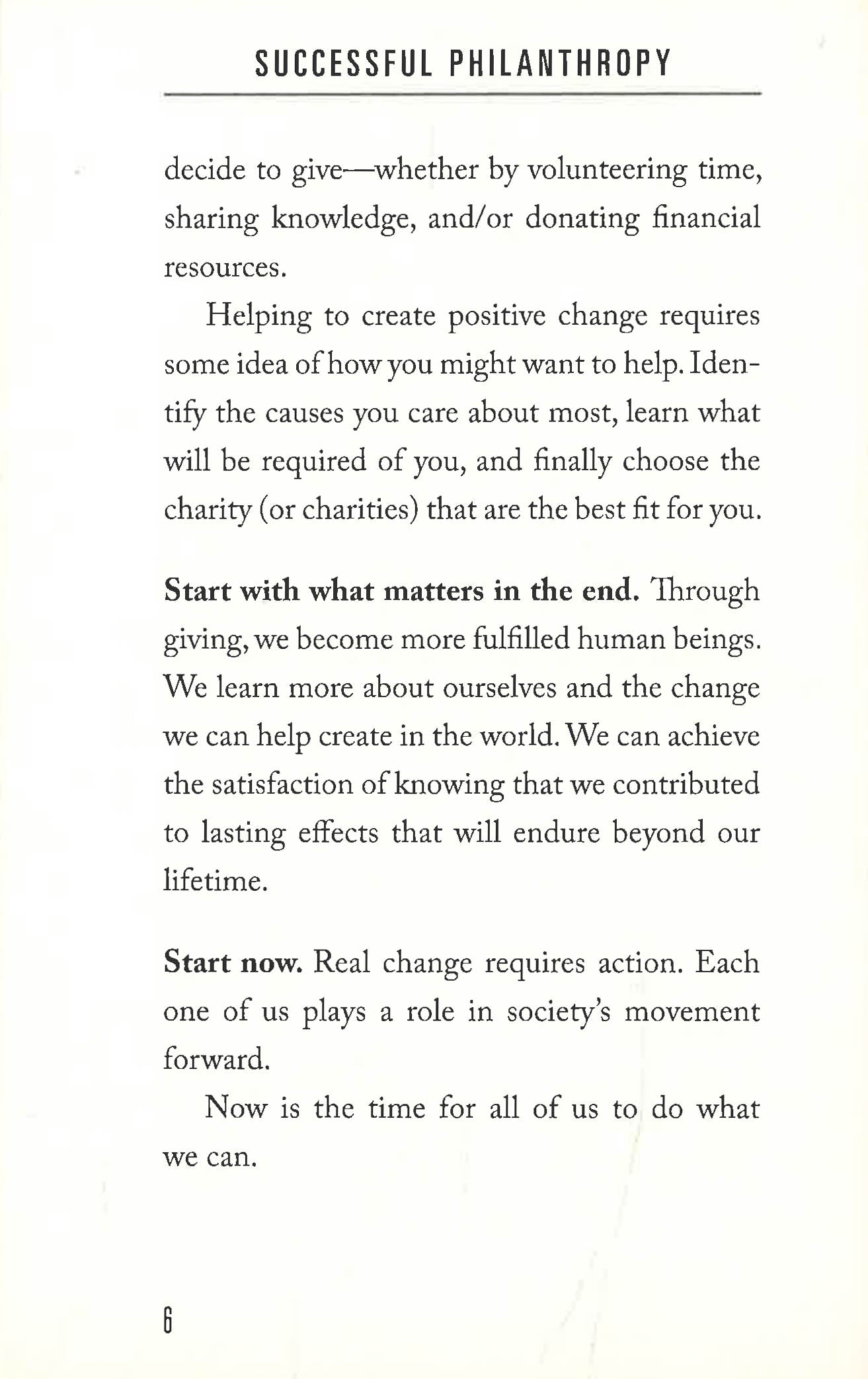 Successful Philanthropy is a practical guide to modern giving that redefines philanthropy for today’s era. Far more than making monetary donations, philanthropy today encompasses giving time and knowledge, resources that can be just as valuable as financial contributions. Whether you’re a new philanthropist, a member of a charity’s Board of Directors, or just getting started as a volunteer, Successful Philanthropy offers the practical guidance and inspiring perspective that empowers all of us to take part in building a better world.