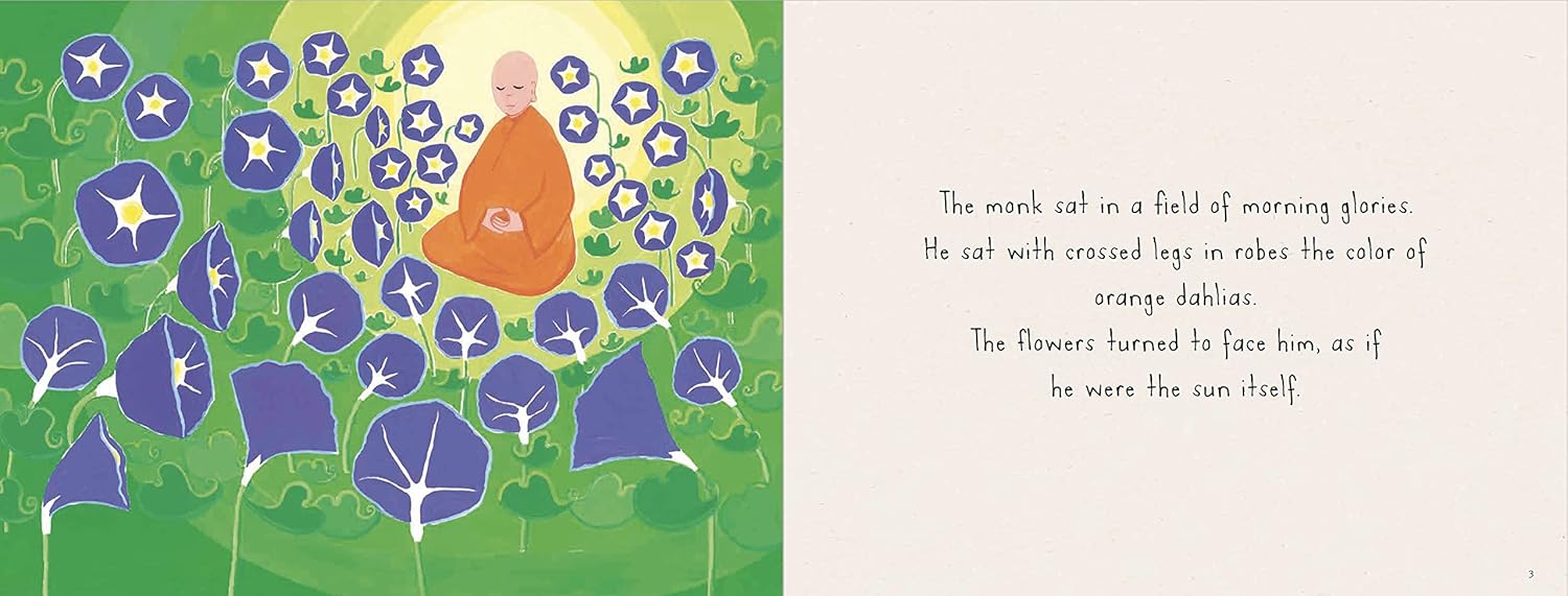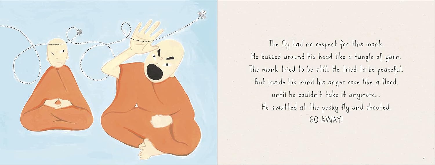 The monk is almost never angry. But when a pesky fly comes buzzing happily by, zipping around his head, landing on his nose day after day, the monk becomes very angry indeed. This makes him confused and sad. Until one day, the monk stops to look at this irritating fly more closely. That is when he sees something truly wonderful!