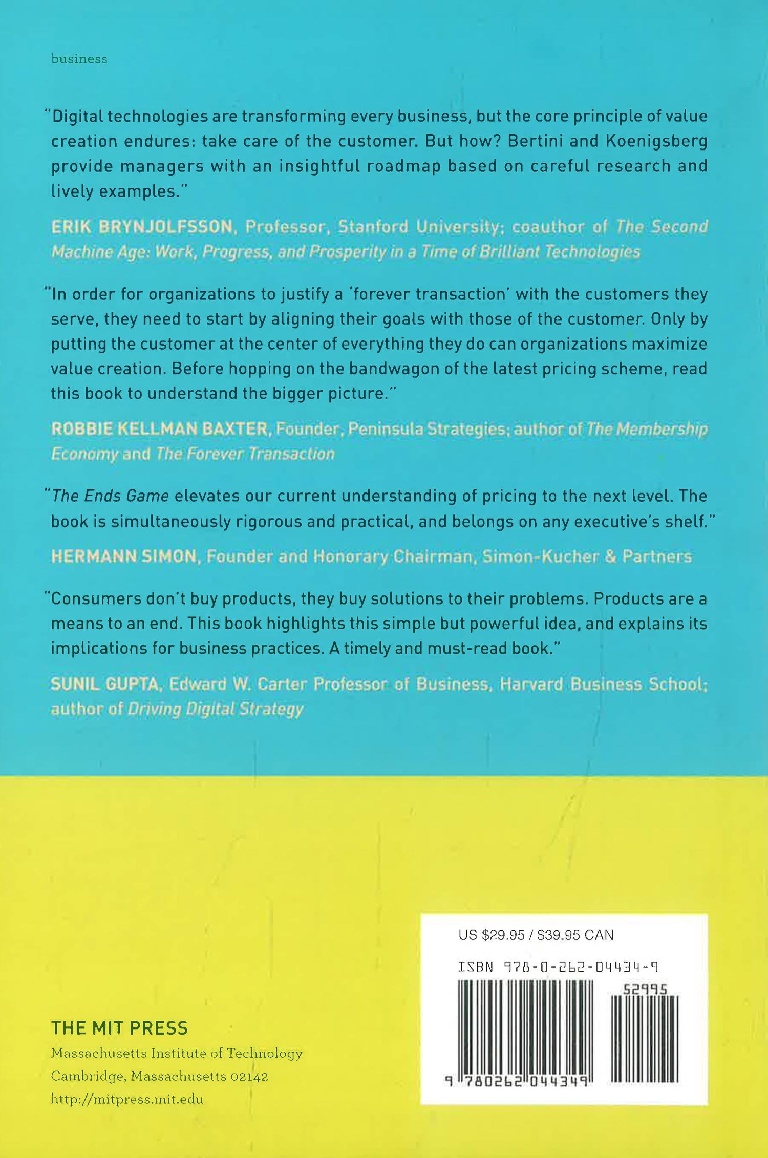 Would you rather pay for healthcare or for better health? For school or education? For groceries or nutrition? A car or transportation? A theater performance or entertainment? In The Ends Game, Marco Bertini and Oded Koenigsberg describe how some firms are rewriting the rules of commerce: instead of selling the “means” (their products and services), they adopt innovative revenue models to pursue “ends” (actual outcomes). They show that paying by the pill, semester, food item, vehicle, or show does not necessarily reflect the value that customers actually derive from their purchases. Revenue models anchored on the ownership of products, they argue, are patently inferior.