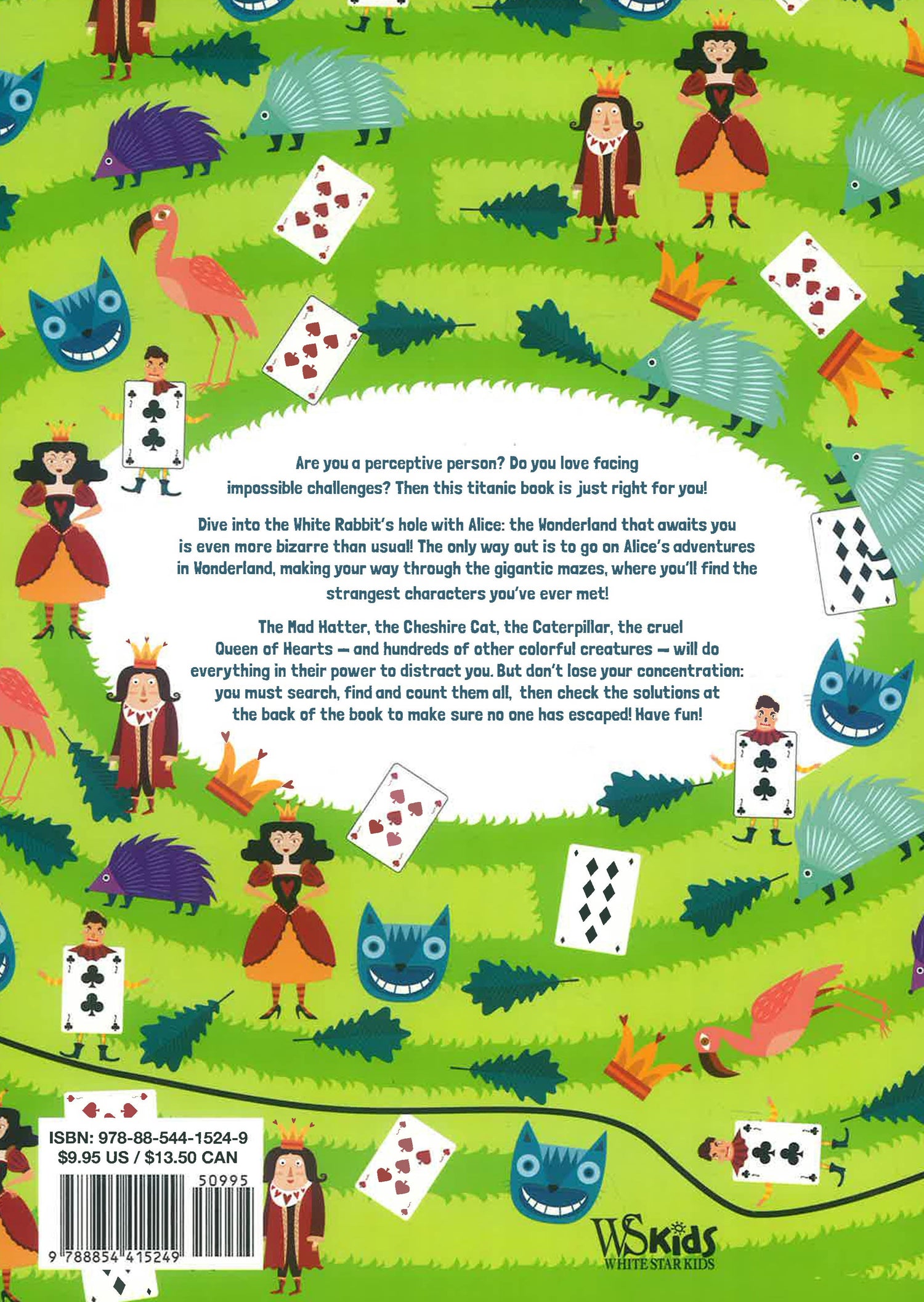 See Wonderland in a whole new way! The well-known characters from Lewis Carroll’s beloved book—including Alice herself, the White Rabbit, the Cheshire Cat, and the cruel Queen of Hearts—peek out from tangled paths, just waiting for you to solve these gigantic mazes. In addition, there’s a fun game throughout as kids try to count the number of bizarre creatures in each maze, and write the number in a box below. Make sure not to miss a single one!