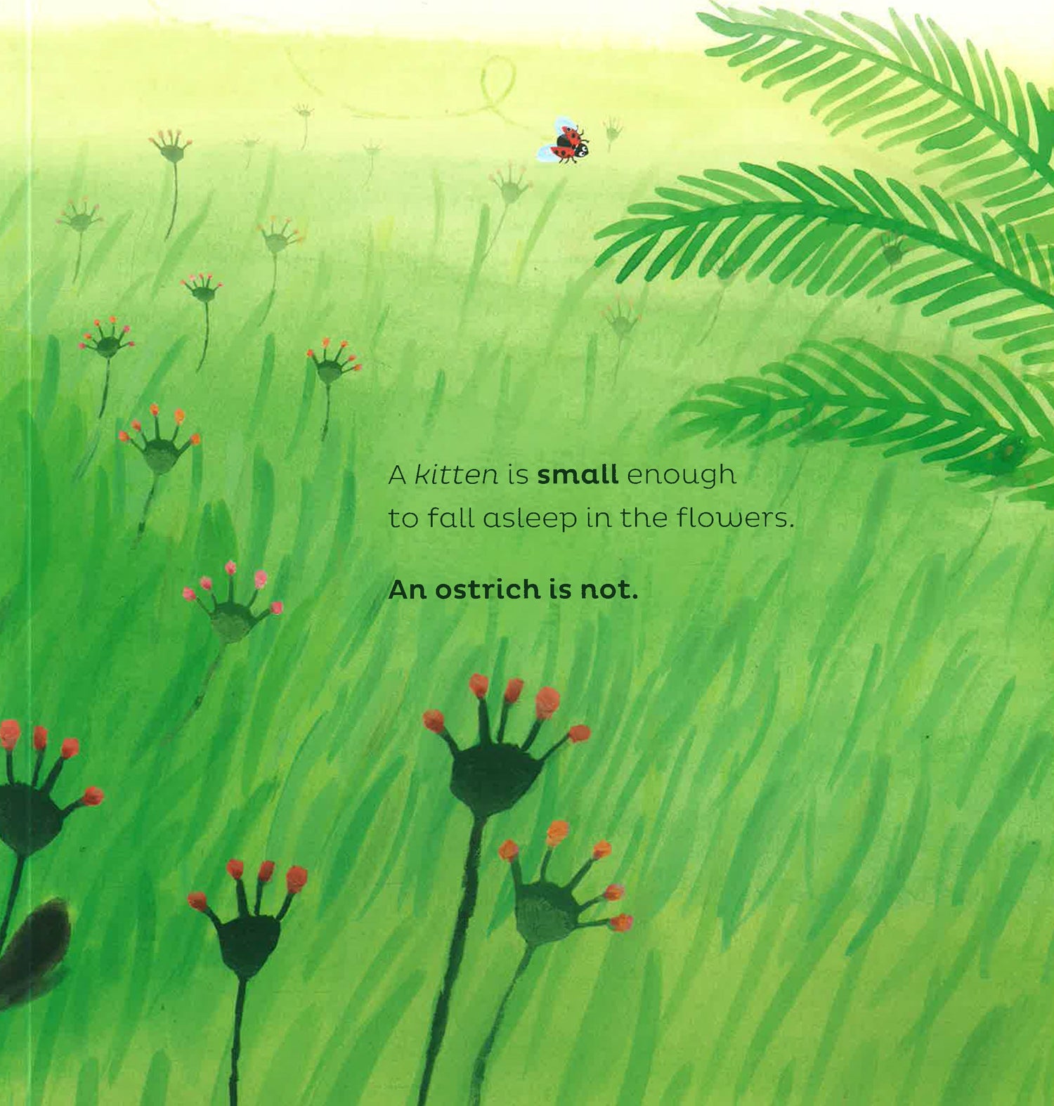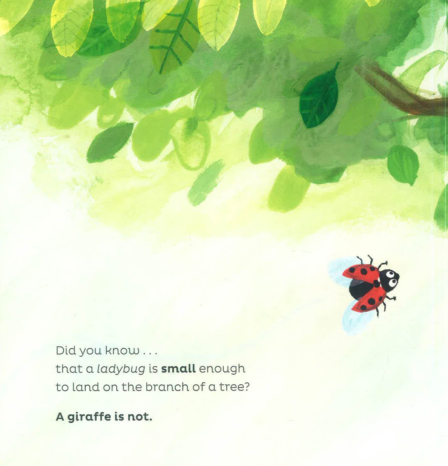 Did you know a ladybug is just the right size to land on the branch of a tree? That would be difficult for a giraffe. But then, a giraffe is just the right size to reach the highest branches. Did you know that a frog is small enough to perch on a lily pad? A hippopotamus is not (obviously), but he is big enough to scare even a crocodile away! In her latest picture book, Bonnie Grubman explores the basic concepts of big and small by putting all sorts of living creatures in odd oppositions. And you? What are YOU just the right size for?