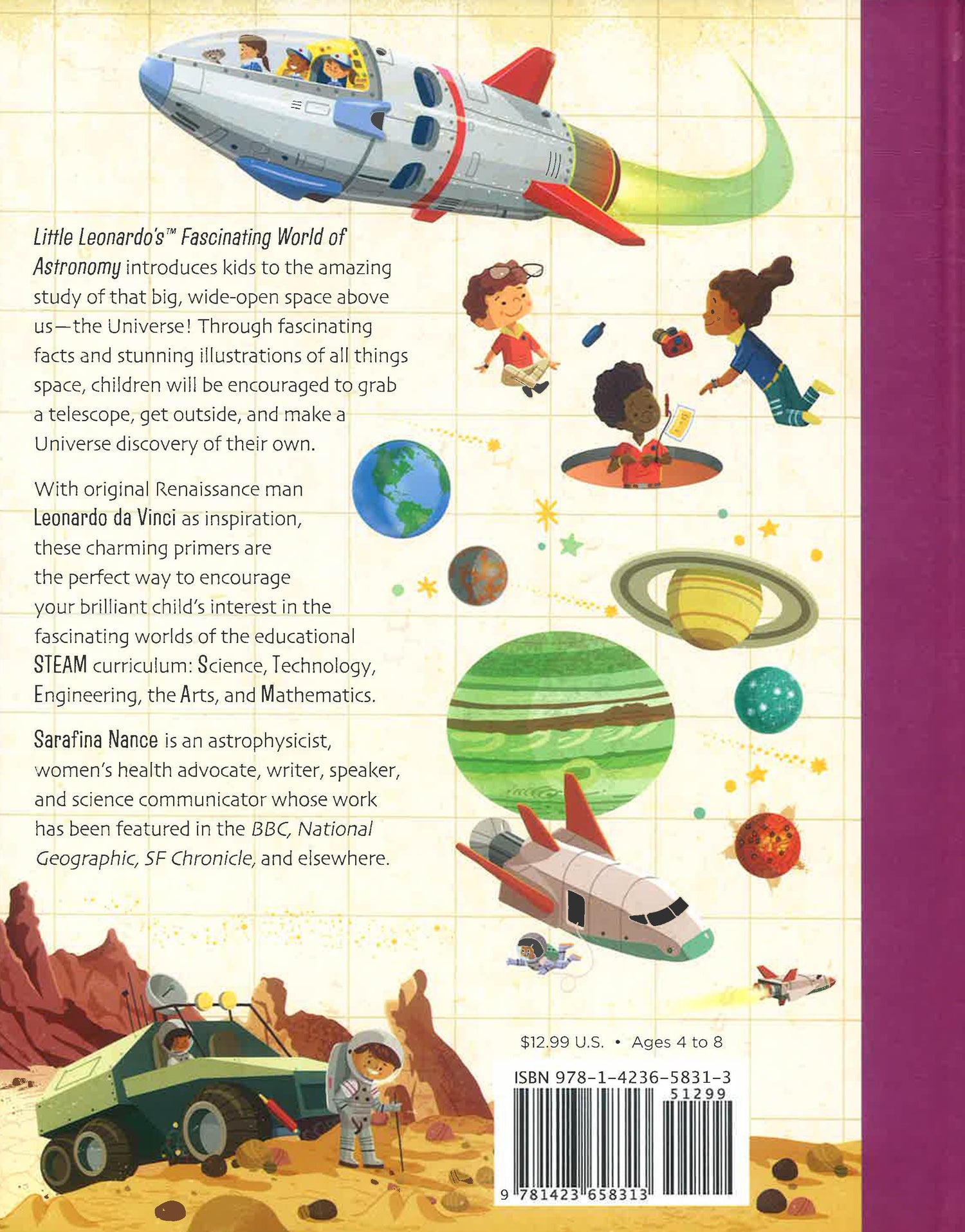 Join author Sarafina Nance, a real-life astrophysicist and one of Forbes magazine "30 inspirational women," as she guides you through 22 fascinating pages of fun facts all about the universe. Get lost in captivating illustrations and text about that big wide-open space above us. Did you know that everything you can see, touch, taste, and smell is actually just a teeny tiny part of the Universe? Or that even though Earth has only 1 moon, Jupiter has 79 and Saturn has 82? Or did you know that there is a planet that’s made of diamond? Little Leonardo’s Fascinating World of Astronomy joins the Little Leonardo Fascinating World of series, illustrated by Greg Paprocki.