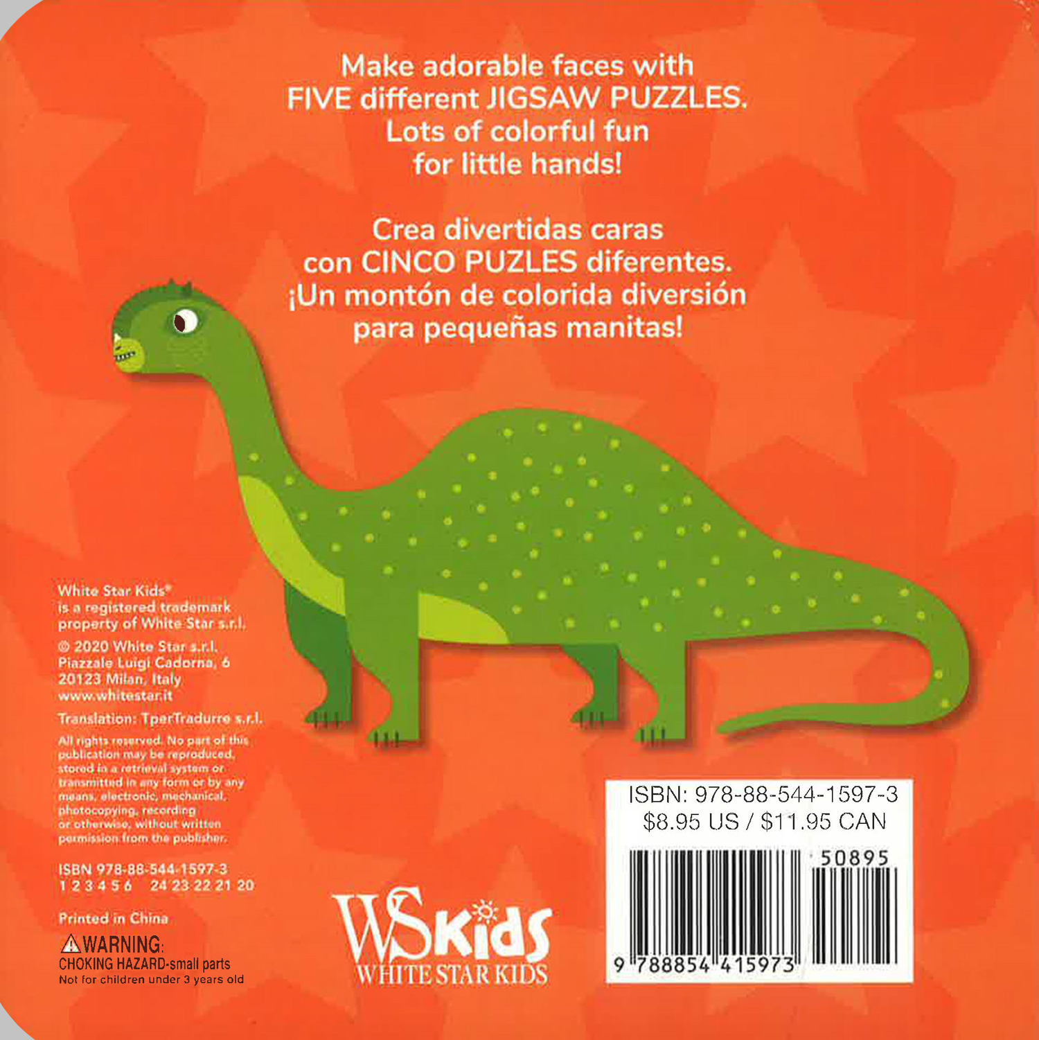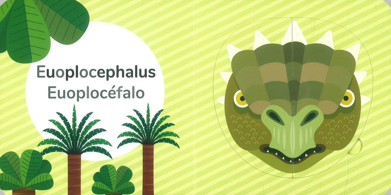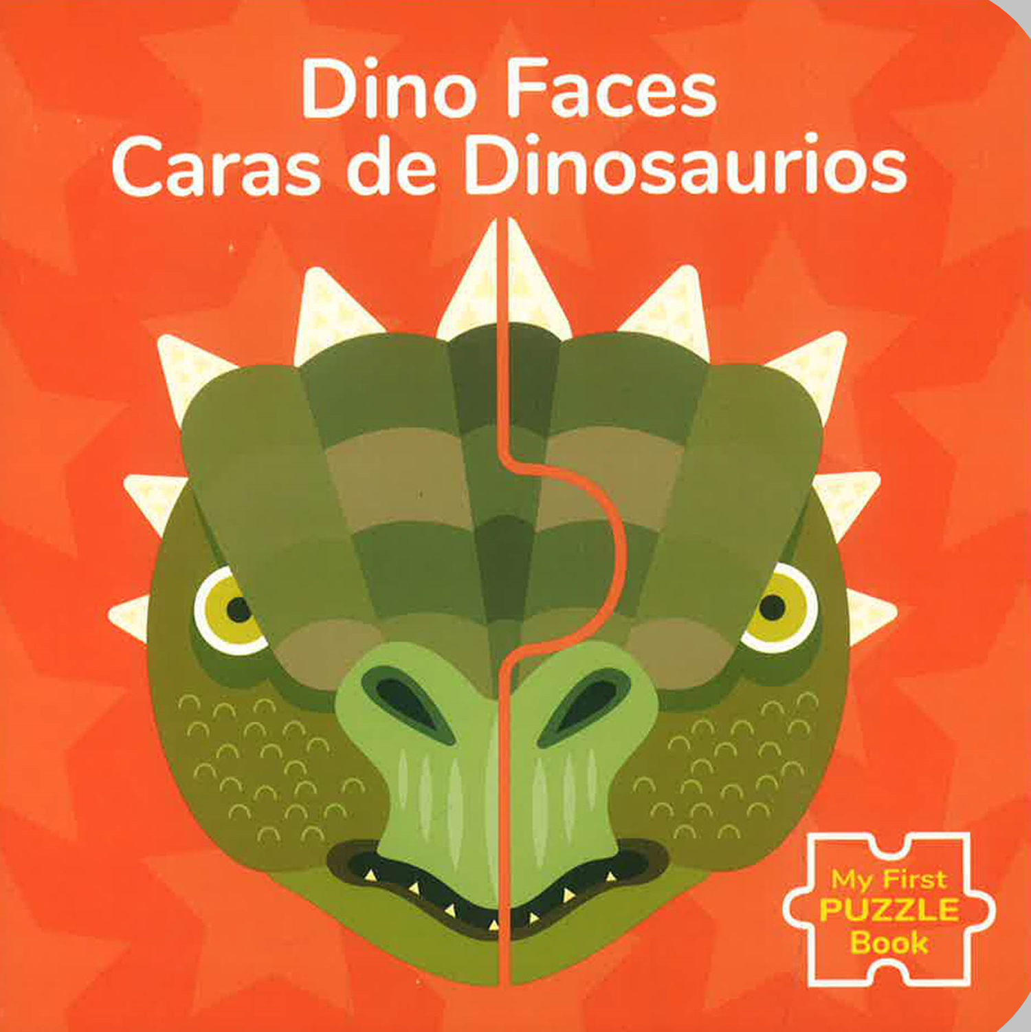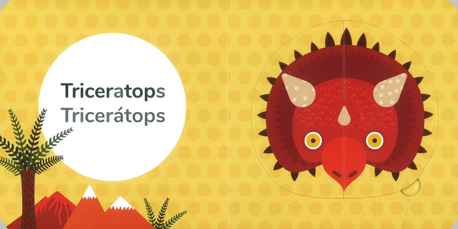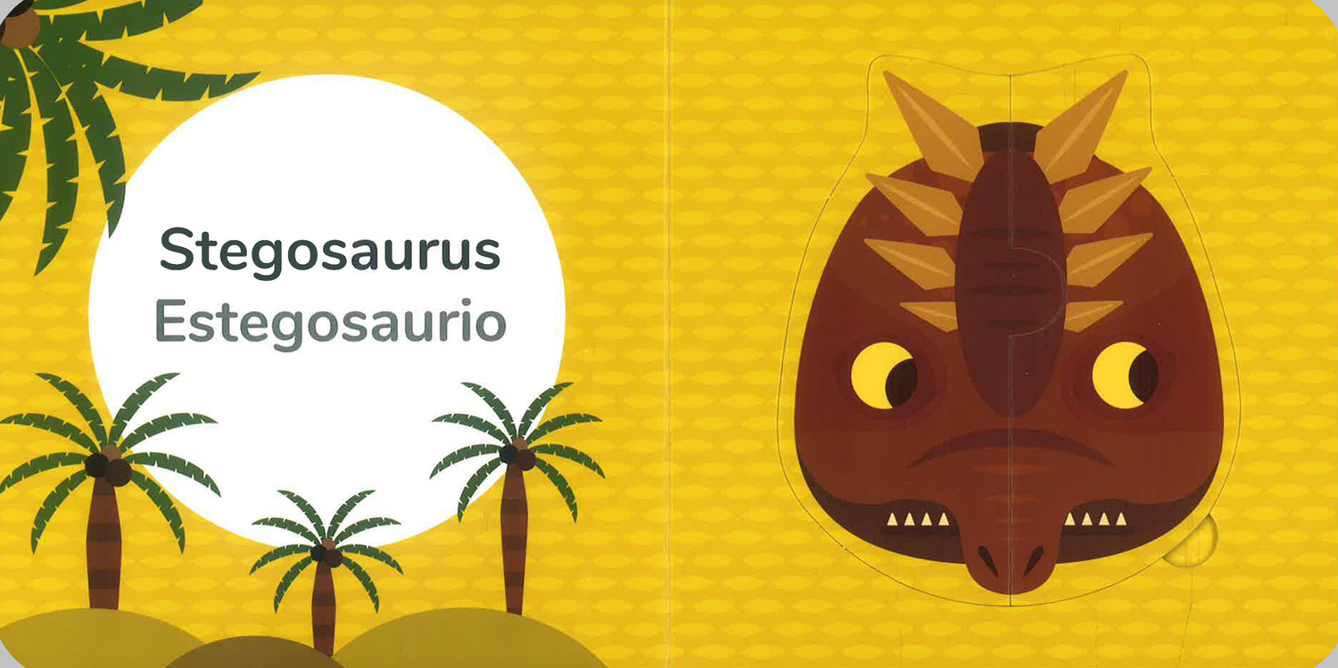 With this cute board book, toddlers can learn as they play On each colorful spread, they'll find the name of a dinosaur in both English and Spanish, alongside a two-piece jigsaw puzzle showing the creature's face. For extra fun, kids can mix and match the pieces to create funny new beasts.