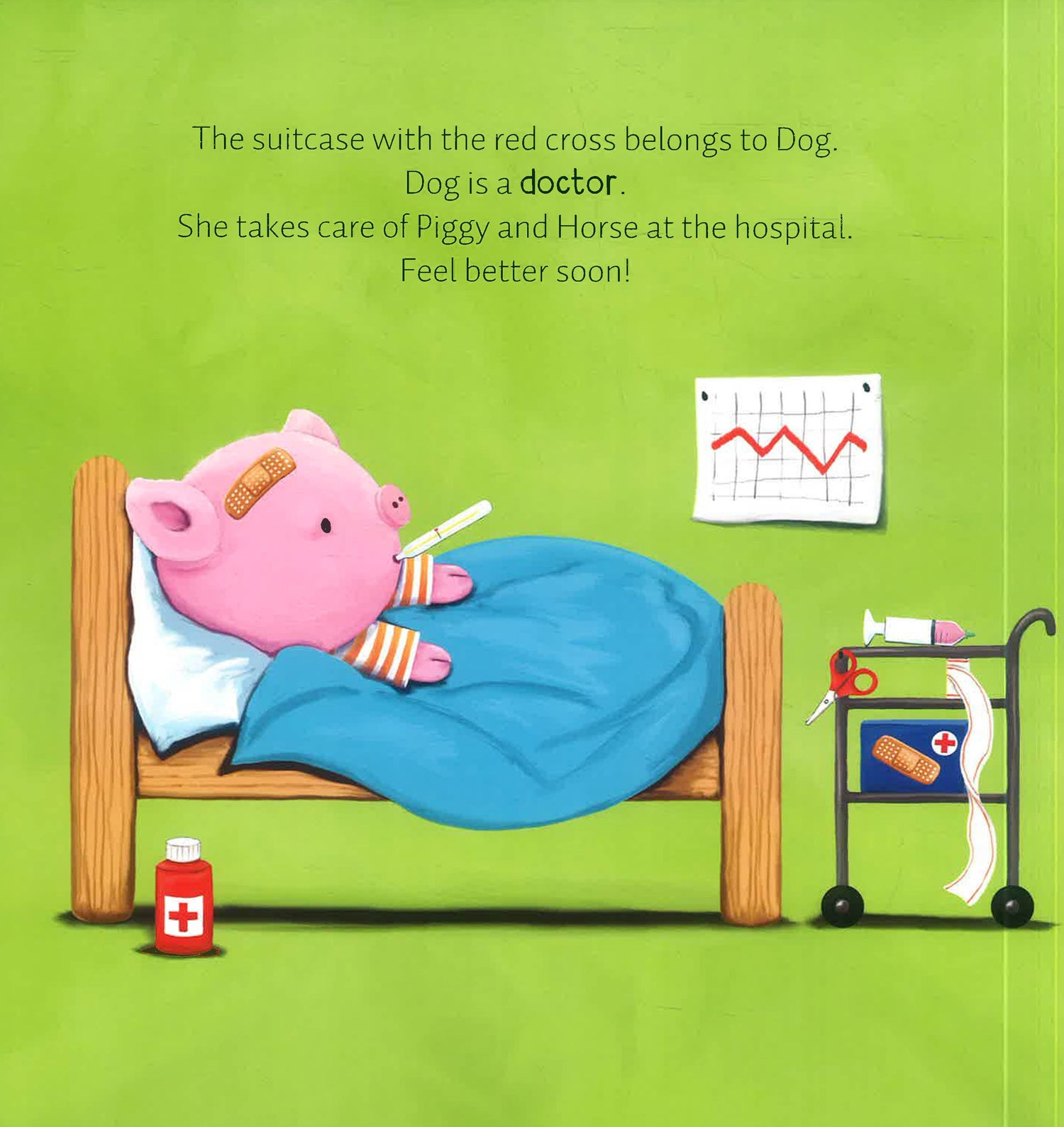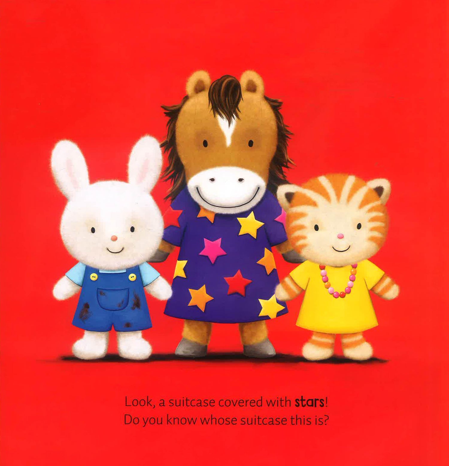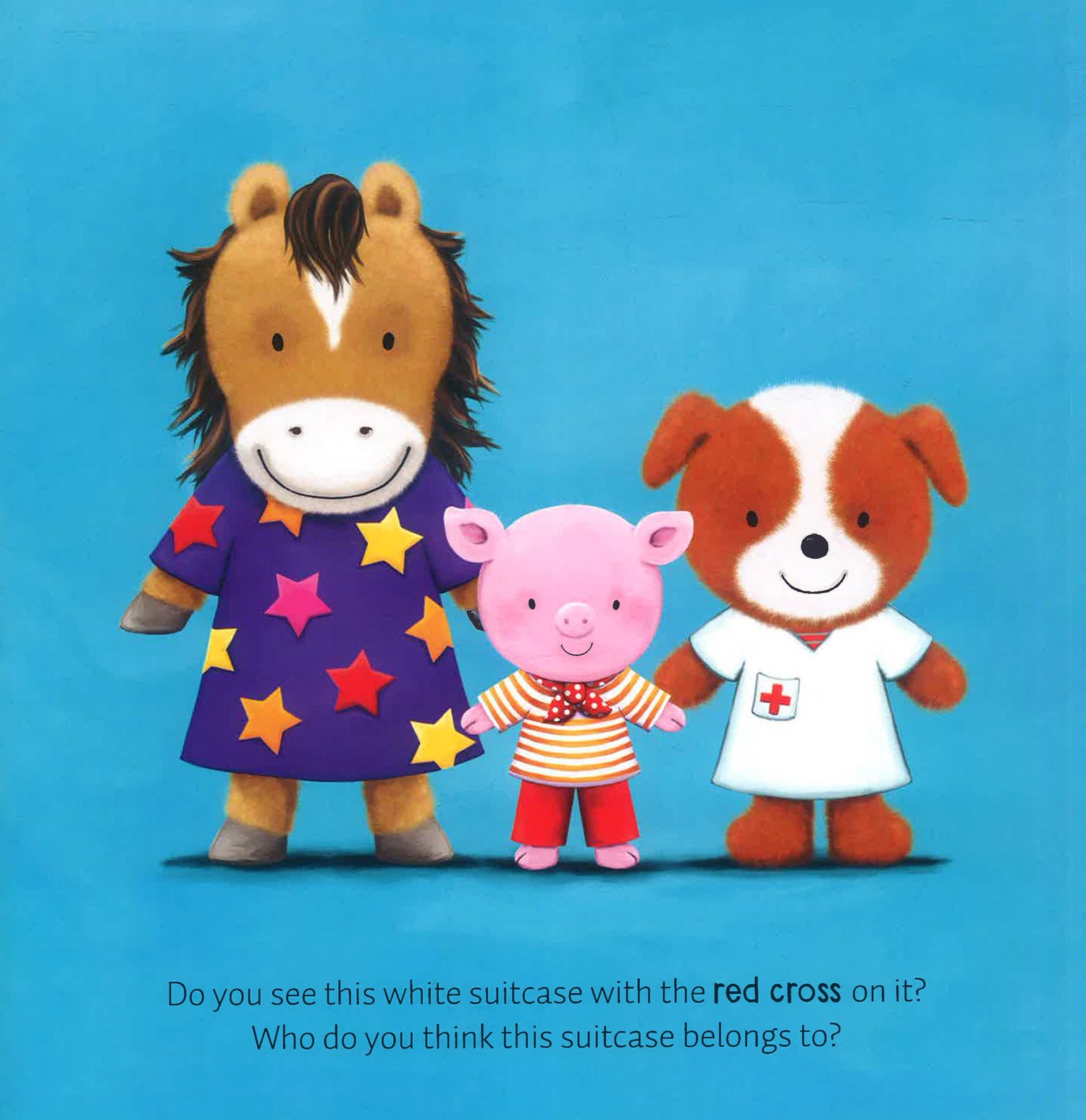 Horse, Cat, Piggy and the other animals all have important jobs to do. They carry their belongings in suitcases. Which bag belongs to whom? Open the suitcases and take a look inside.