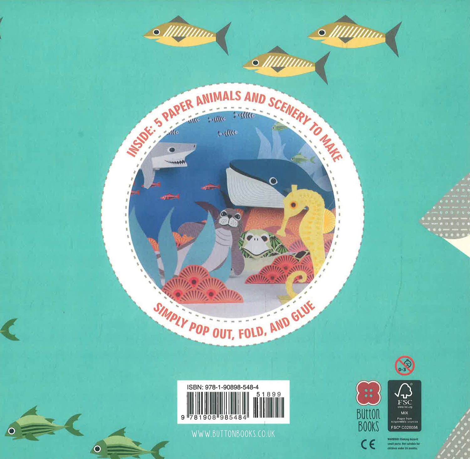 Teach your children about our aquatic friends with this fun and educational book. Five sea creatures - a shark, turtle, seahorse, seal and whale - are explored through rhyme, pictures and pull-out cards. With two spreads dedicated to each creature, adults will be able to read the short playful rhyme on each spread to children and look at the bright illustrations to teach them about their habits and environment. Children will then be able to pop out the card animals from the perforated pages contained in a pocket at the back of the book and create 3D figures simply by folding and adding a few dabs of glue. The inside of the dust jacket is printed full color with a graphical representation of the creatures' environment. Children have the option of using this as a backdrop to create a marine scene, and there are also accessories to make and add to the scene.