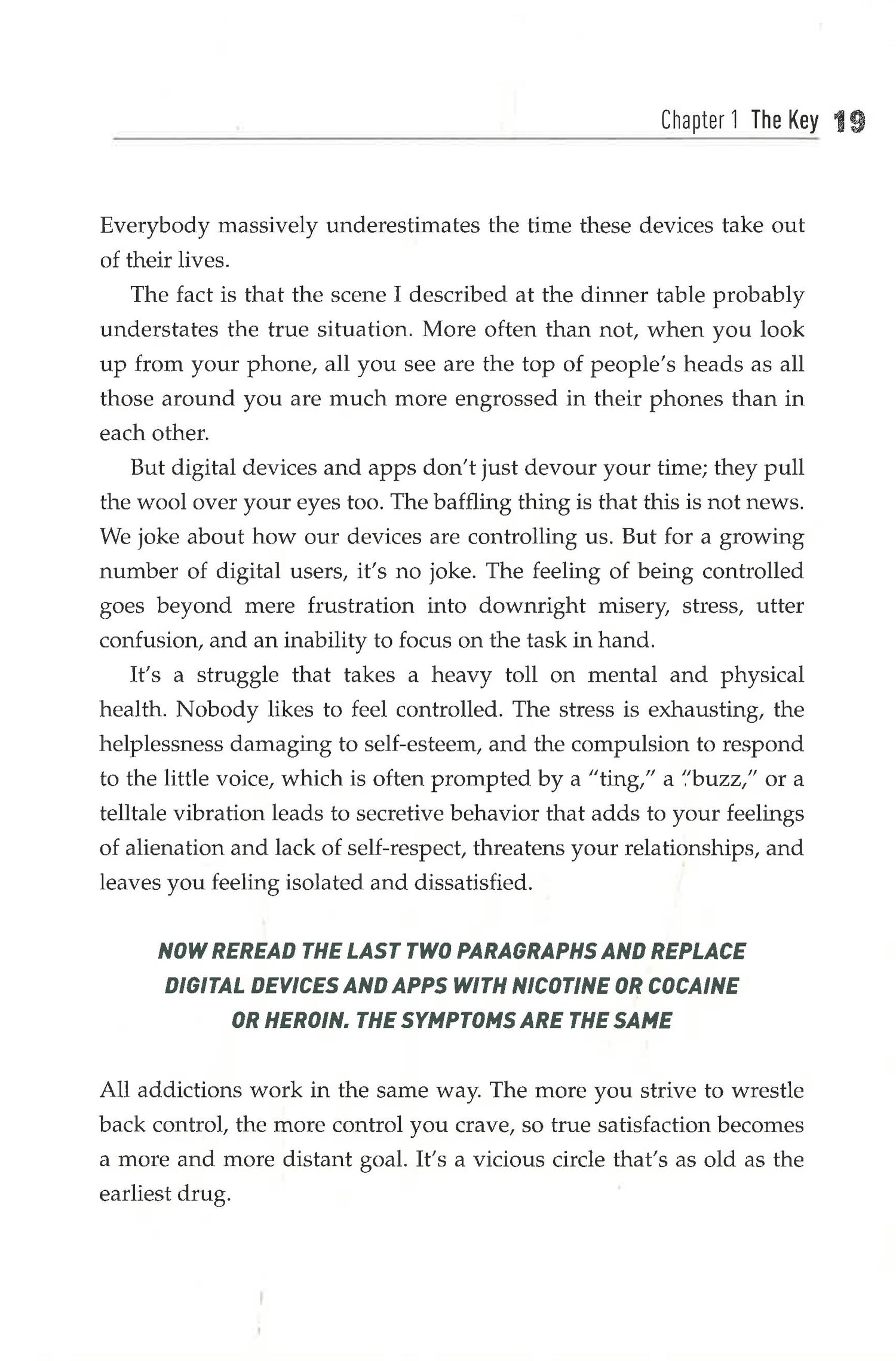 Sadly technology which should be a wonderful boon to us has started to blight our lives. The average adult spends nearly ten hours a day looking at digital screens, leading to unprecedented levels of stress, isolation, procrastination and inertia. The fact is that digital dependence is an addiction and should be treated as such.