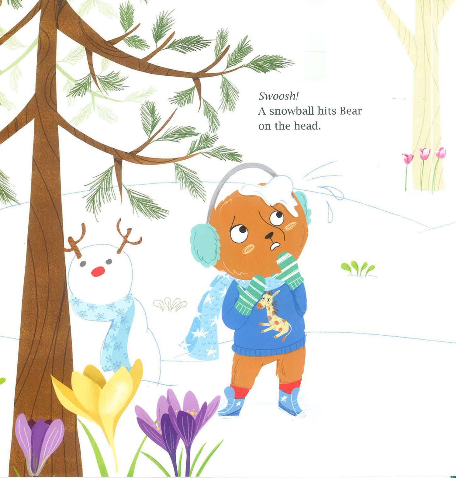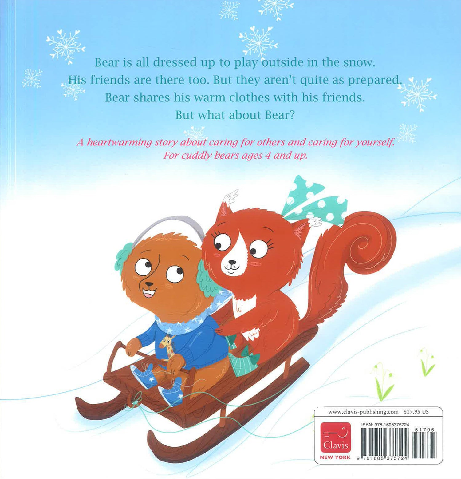 Bear is all dressed up to play outside in the snow. His friends are there too. But they aren’t quite as prepared. Bear shares his warm clothes with his friends. But what about Bear?