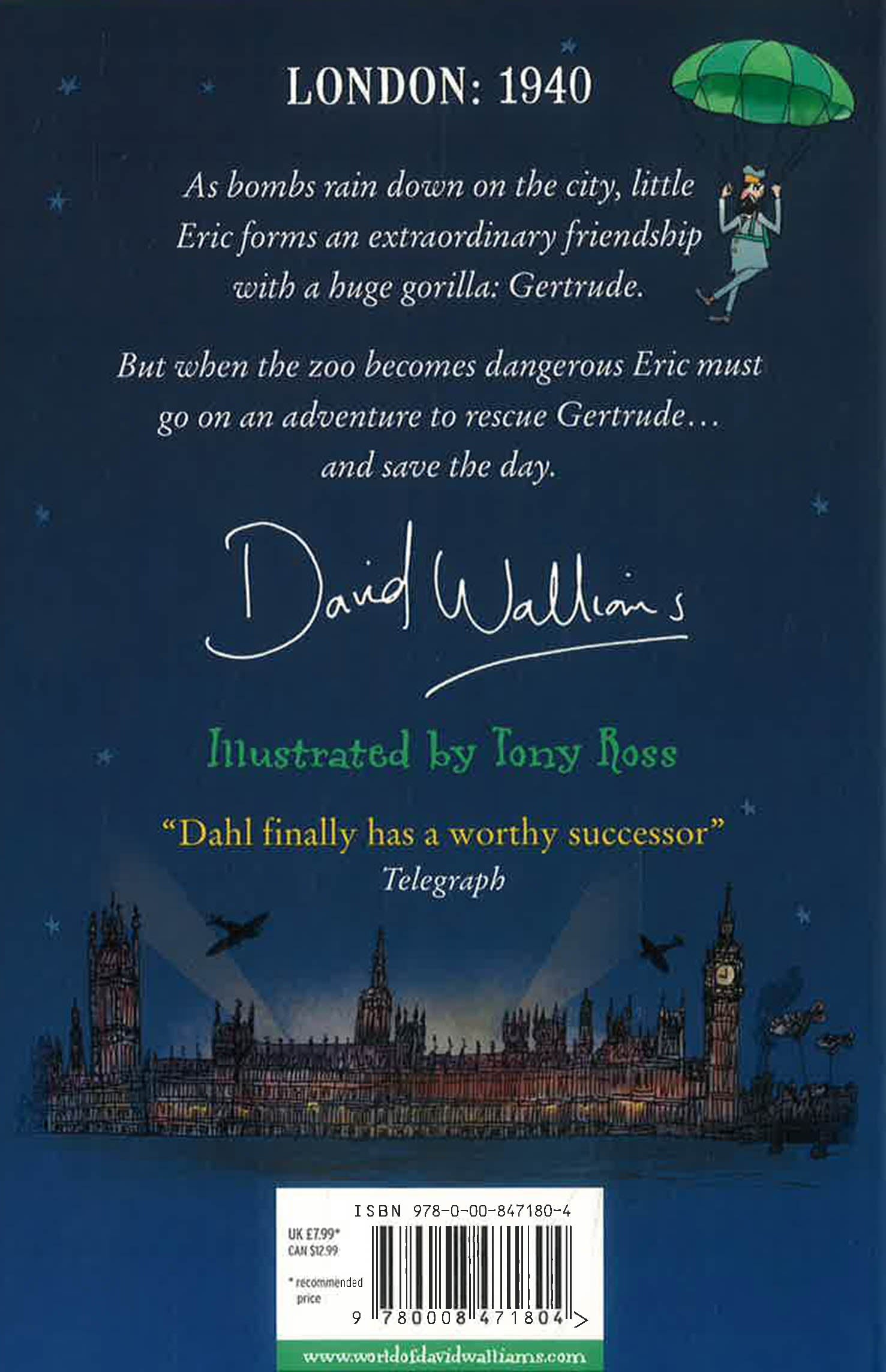 Go back in time with No. 1 bestselling author David Walliams for a whizz-bang epic adventure of action, laughter and secret plots – and the extraordinary friendship between a little boy and a huge gorilla that just might save the day…1940. Britain is at war with Nazi Germany.Eleven-year-old Eric spends his days at the place that makes him most happy: London Zoo. And there’s one animal in particular he loves: Gertrude the gorilla.With bombs falling all over London, Eric must rescue Gertrude.Together with his Uncle Sid, a keeper at the zoo, the three go on the run. But while hiding out at the seaside they uncover a top-secret Nazi plot…Join David Walliams on this action-packed, laugh-out-loud adventure for all the family!