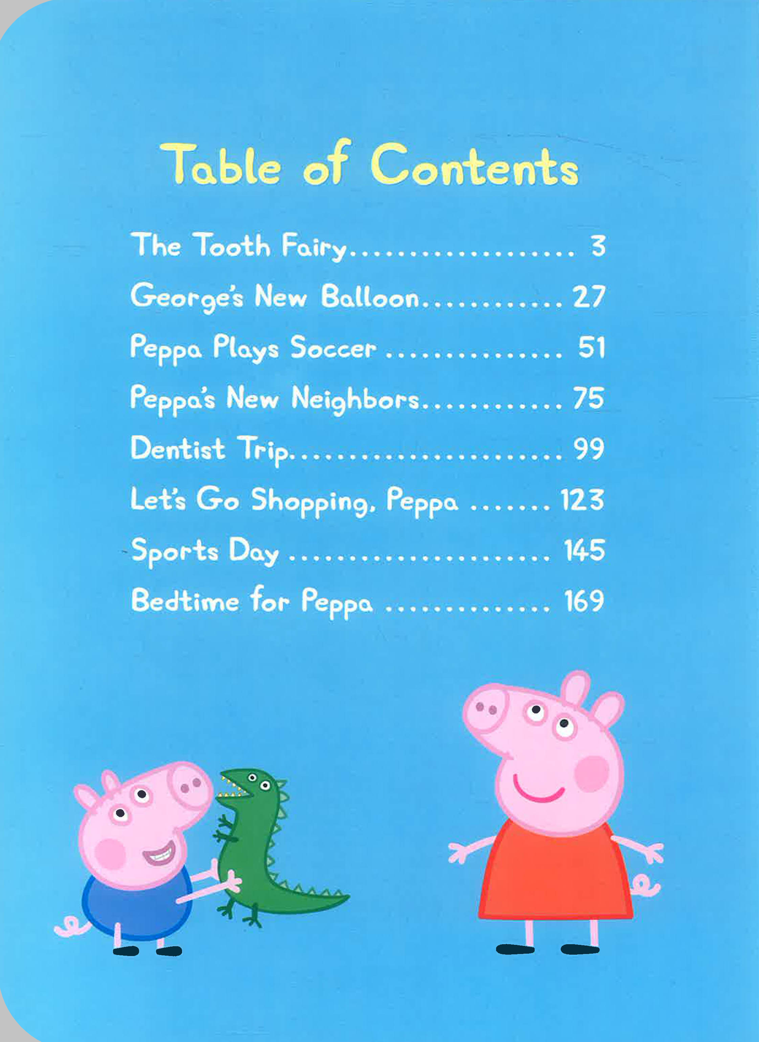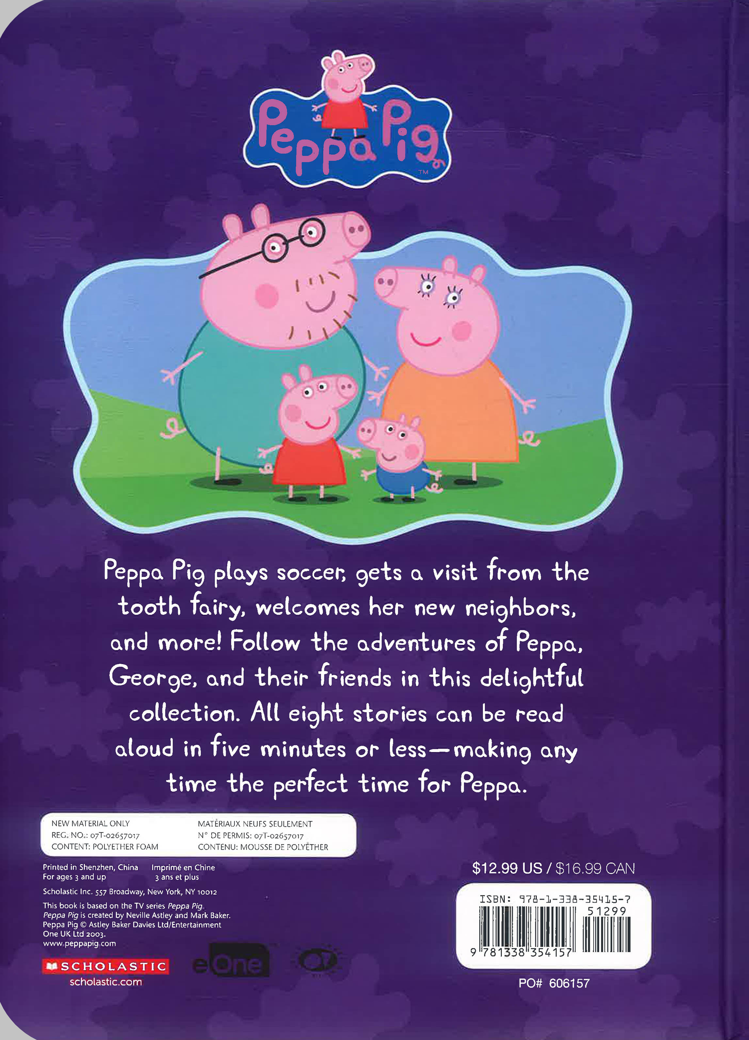Peppa Pig plays soccer, gets a visit from the tooth fairy, welcomes her new neighbors, and more! Follow the adventures of Peppa, George, and their friends in this delightful collection. All eight stories can be read aloud in five minutes or less - making any time the perfect time for Peppa.