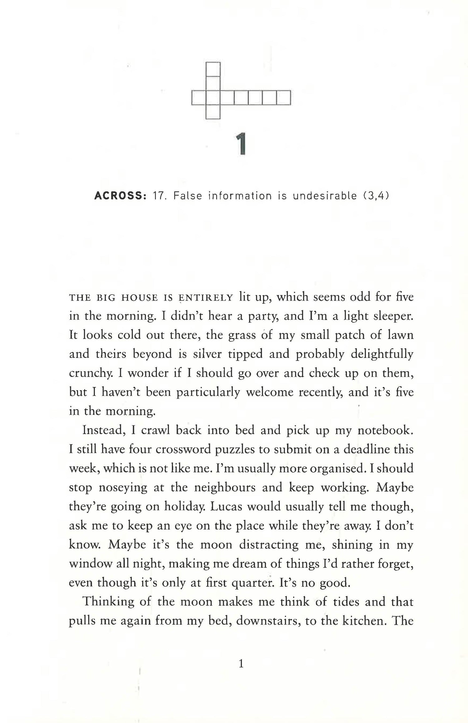 Merry lives a simple life on the Isle of Wight. For work, she creates cryptic crosswords. For pleasure, she swims in the ocean's cold embrace. In between, she keeps an eye on her neighbour, Lucas Manning, son of her late best friend Julia. Until one day, Lucas disappears.