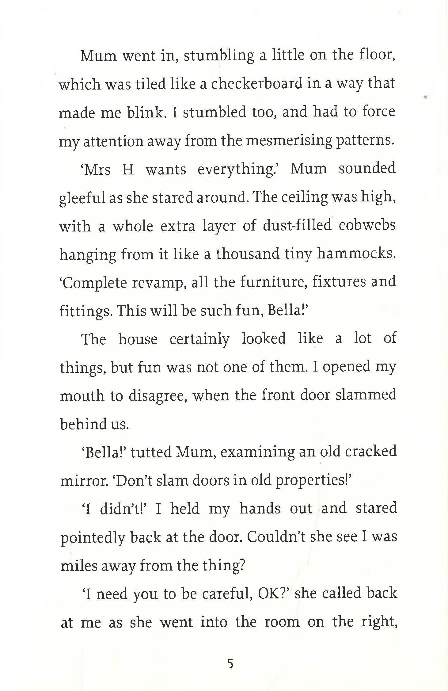 Skylar suggests they play hide and seek, but as she utters the words, the house appears to wobble and they discover all the exits are impossibly locked. Bella searches the manor and a ghostly teenage girl appears in front of her. She reveals herself to be Alice, a young girl who died in the house 150 years ago during a game of hide and seek gone terribly wrong. She has hidden Bella's three friends, and gives Bella a rhyming clue to find them in the enormous and cavernous house.