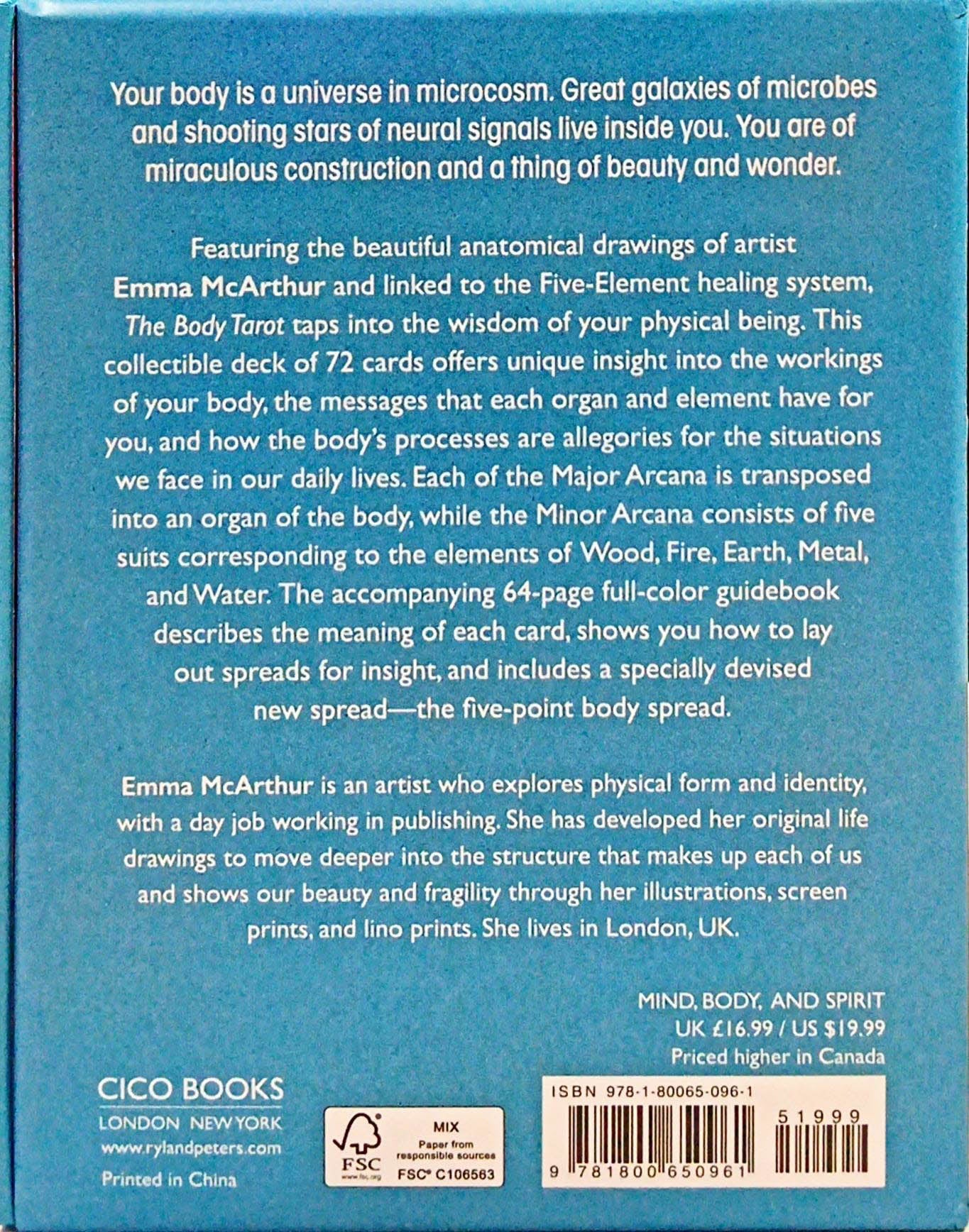 Your body is a universe in microcosm. Great galaxies of microbes and shooting stars of neural signals live inside you. You are of miraculous construction and a thing of beauty and wonder. Featuring the beautiful anatomical drawings of artist Emma McArthur and linked to the Five-Element healing system, The Body Tarot taps into the wisdom of your physical being. This collectible deck offers unique insight into the workings of your body and the messages that each organ and element have for you. You will learn a bit more about how your body works and how those processes are allegories for the situations we face in our daily lives. The Major Arcana is transposed into the major body organs, while the Minor Arcana consists of five suits corresponding to the Eastern elements of Wood, Fire, Earth, Metal and Water. As well as describing the meaning of each card, the accompanying guidebook shows you how to lay out spreads for insights into any aspect of your life, such as your relationships, health or career, and includes a new spread specially devised for this system – the five-point body spread.