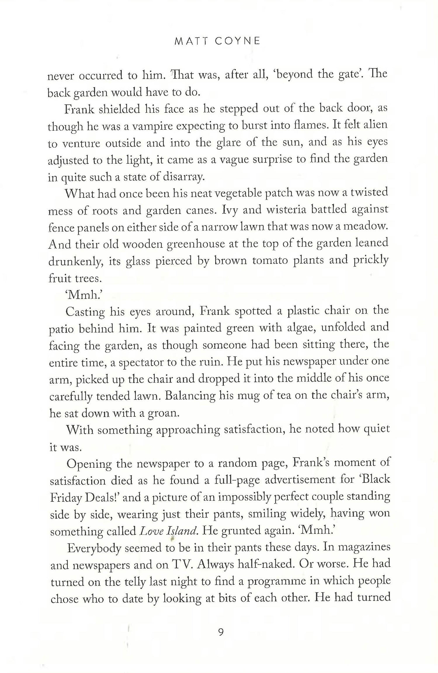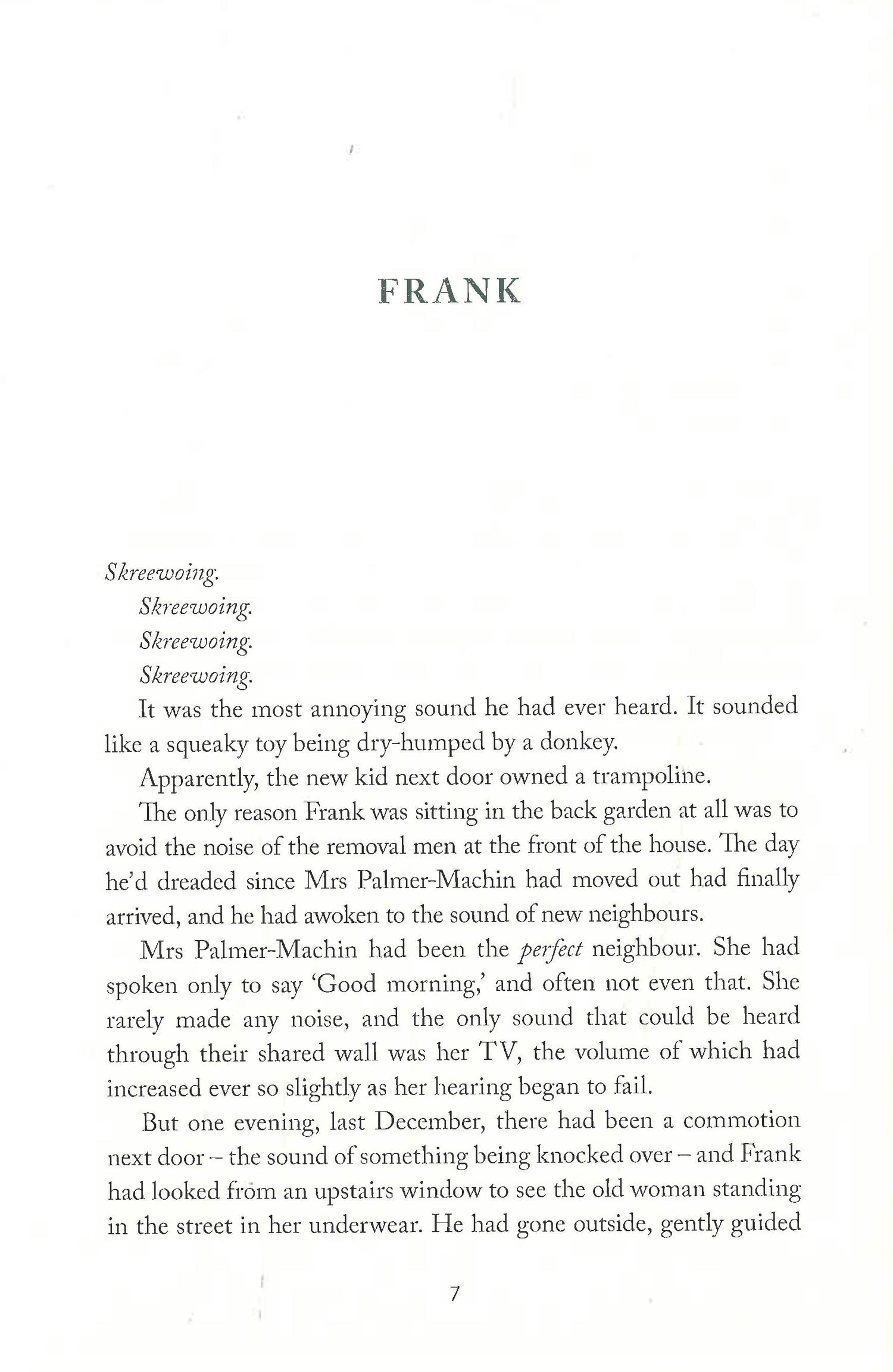 Frank is a grumpy old curmudgeon. A recluse whose only company is the 'ghost' of his dead wife, Marcie. He is estranged from his friends, his son, and the ever-changing world beyond his front gate.