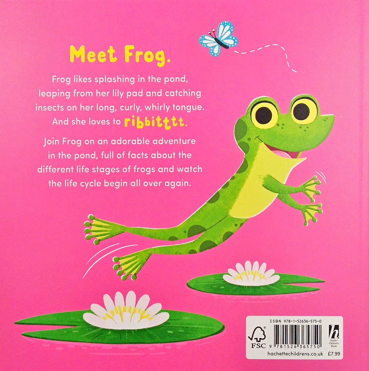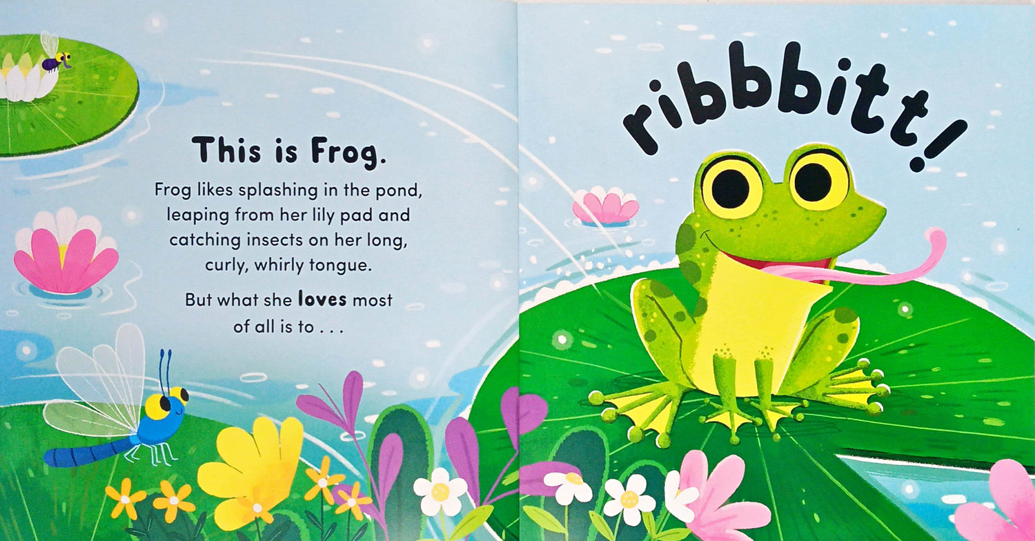 Meet Frog. Frog likes splashing in the pond, leaping from her lily pad and catching insects on her long, curly, whirly tongue. And she loves to RIBBITTTTT.
